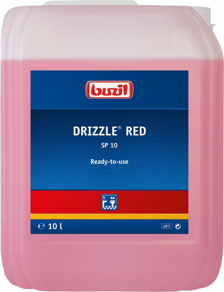 Drizzle Red SP10 to gotowy do użycia, kwaśny środek. Dzięki efektowi EASY – TO – CLEAN w znacznym stopniu ogranicza osadzanie się brudu na nawierzchni. Produkt spontanicznie usuwa resztki kosmetyków i mydła oraz zabrudzenia mineralne, np. naloty wapienne. Produkt nadaje czyszczonej nawierzchni połysk, wysycha szybko bez konieczności dosuszania, jest łagodny dla materiału i prosty w użyciu. Należy rozpylić na ściereczkę, wyczyścić nawierzchnię i spłukać wodą.