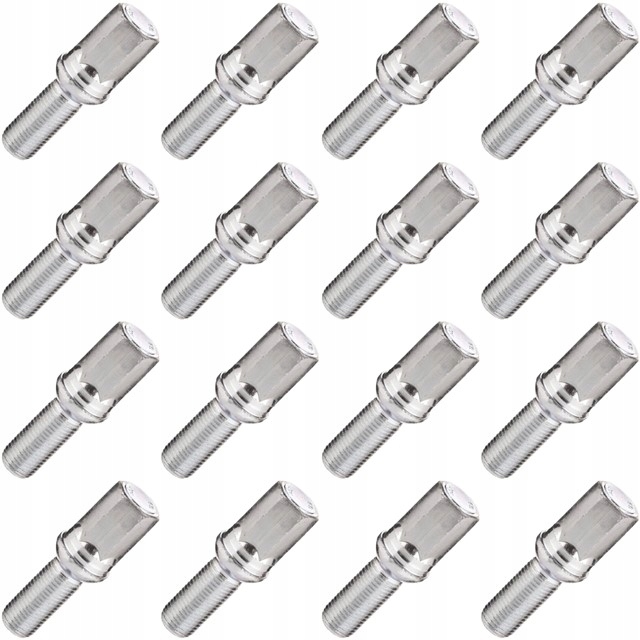 Zestaw składający się z 16 śrub, umożliwiający montaż wszystkich kół w samochodzie, zawierających 4 miejsca montażowe na koło.