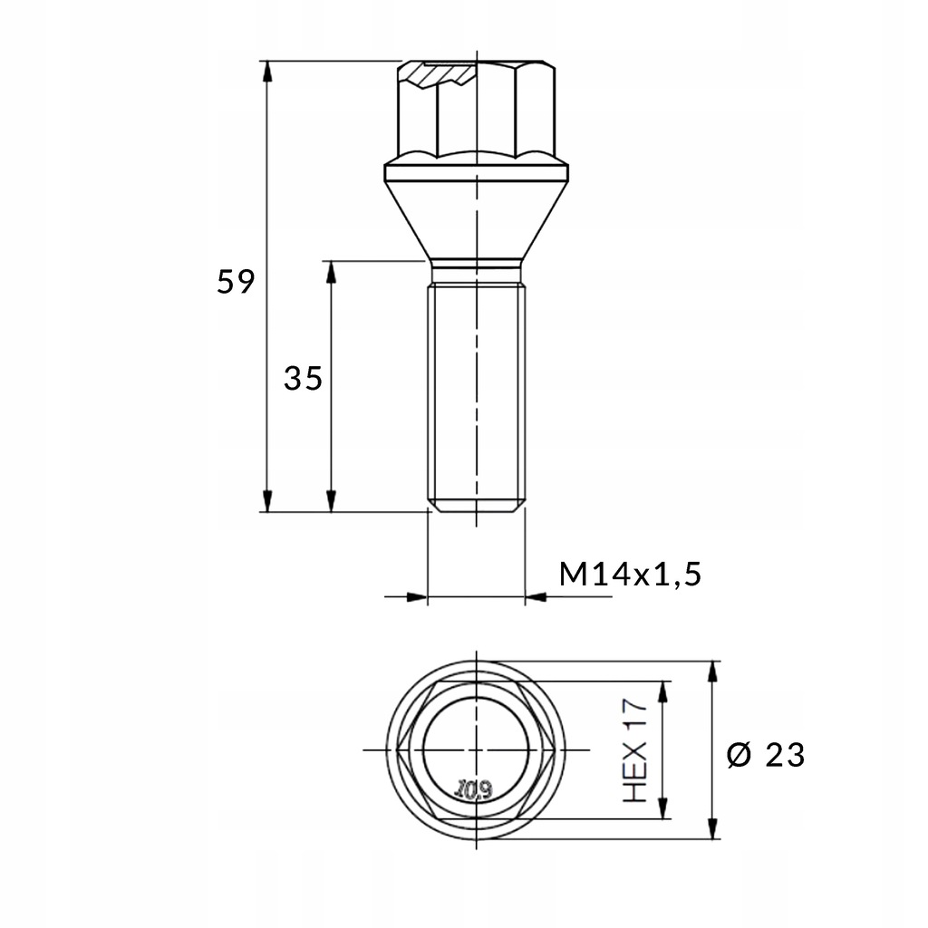 Czarna śruba do felg M14x1.5 35 mm – klucz 17. Stożek