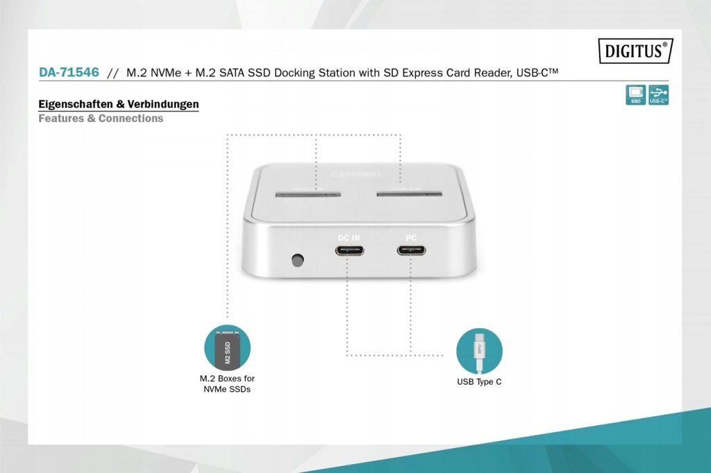 Stacja dokująca 3 w 1 DIGITUS umożliwia dokowanie dysków SSD M.2 w technologii NVMe albo SATA, ponadto znajduje się w niej czytnik kart DS-Express 7.1 o najwyższej prędkości transferu danych. Zarządzaj nośnikiem danych M.2 po 4 TB na każde gniazdo oraz kartami SD do 2 TB. Obsługiwane są dyski SSD NVMe z B+M Key & M-Key oraz dyski SSD SATA z B+M-Key, każdorazowo w formatach 2242, 2260, 2280 & 22110. Powiększ w prosty sposób pojemność pamięci licznych urządzeń USB-C, takich jak komputery, notebooki, sprzęt TV, konsole czy routery.