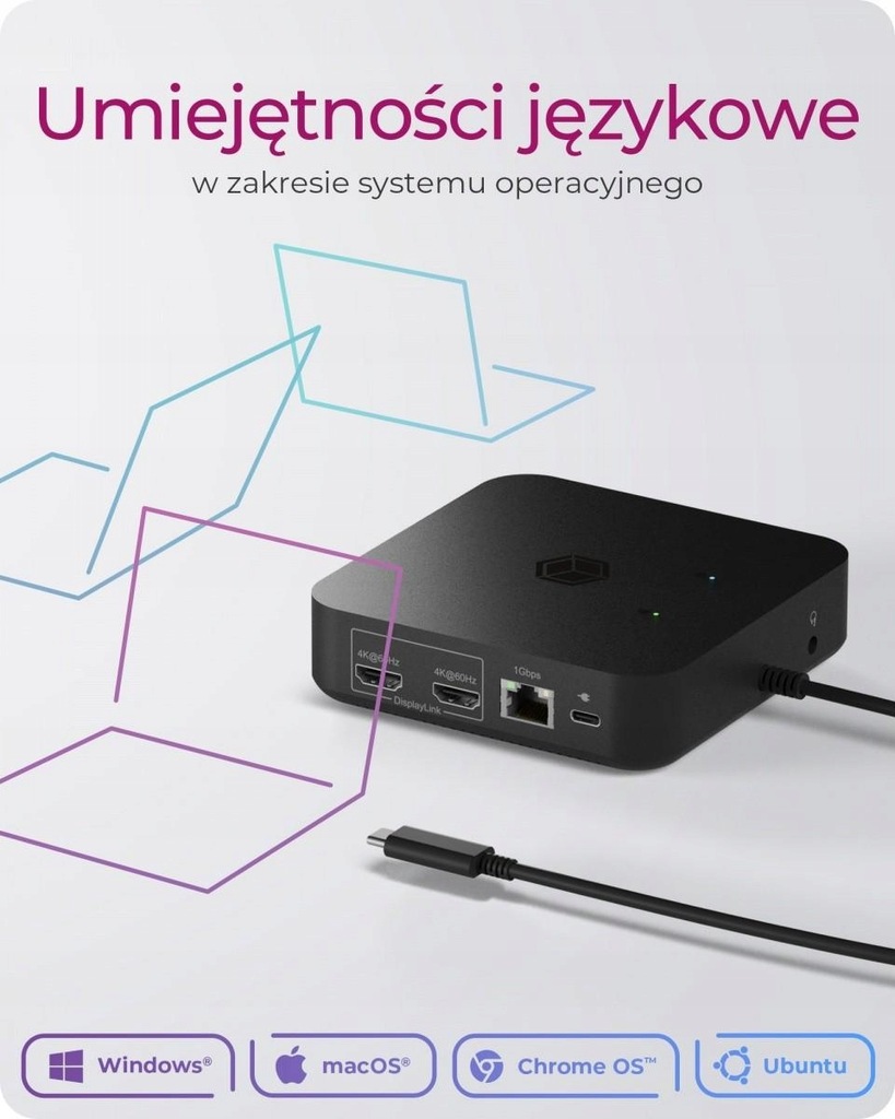 - Wymagania sprzętowe: Windows / macOS / Chrome OS / Ubuntu (Linux) z zainstalowanym sterownikiem DisplayLink Kompatybilny z USB Type-C , Komputery wyposażone w Thunderbolt 3/4 Type-C Funkcja Power Delivery i DP Alt Mode (wyświetlacz 3) tylko za pośrednictwem komputera hosta Type-C z możliwością obsługi Power Delivery i DP Alt Mode Brak zasilacza w zestawie (wymagany tylko do zasilania)