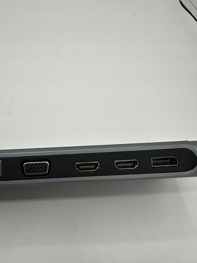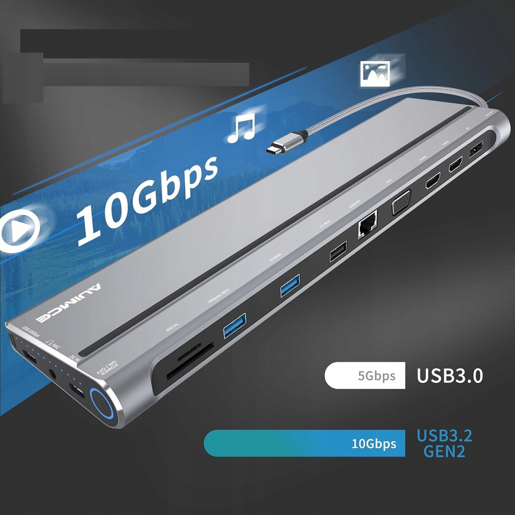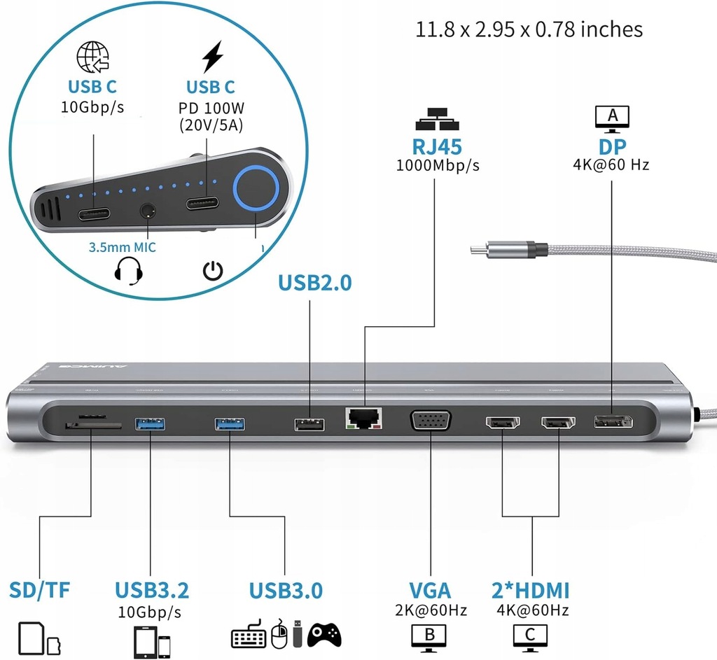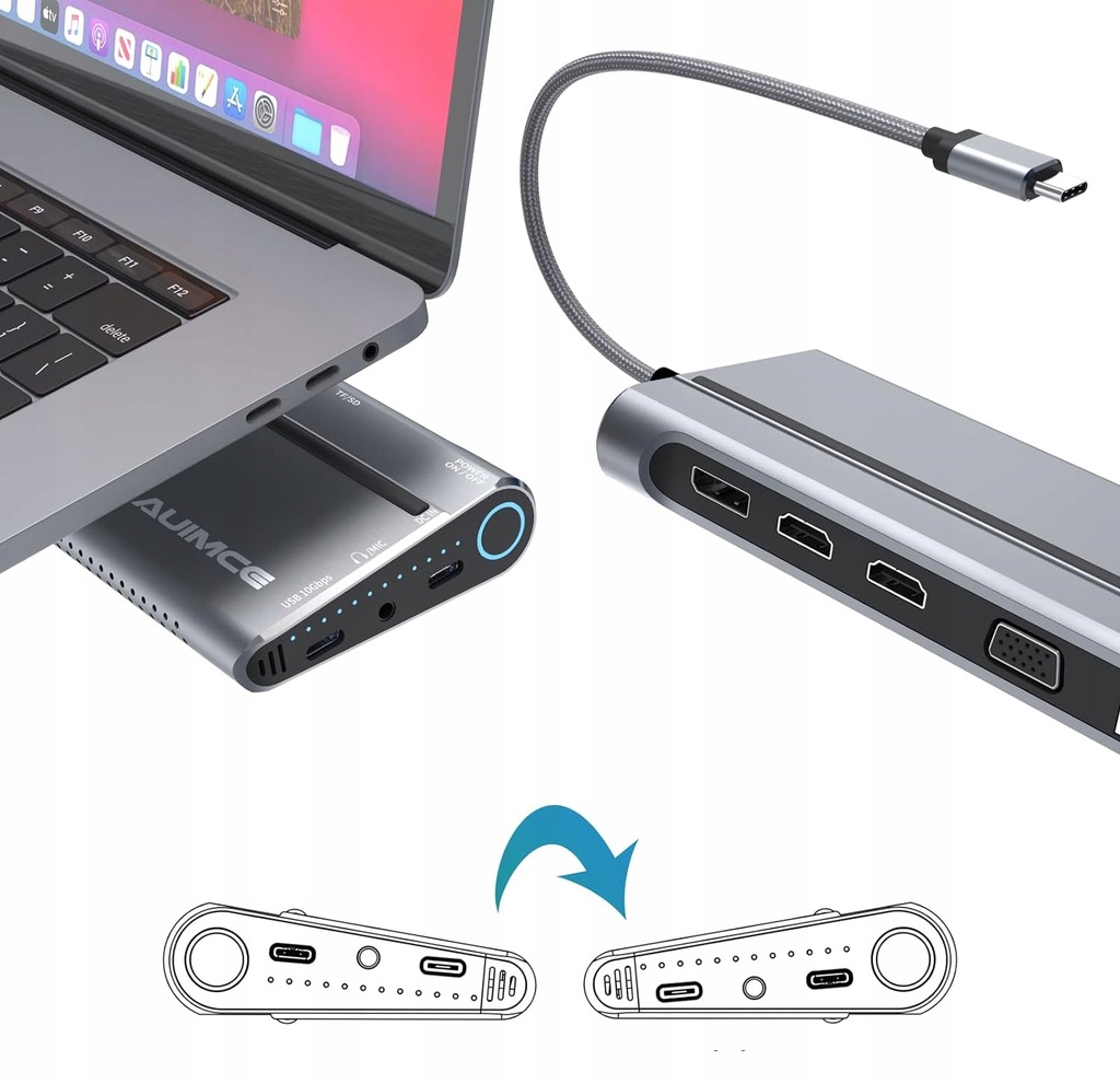 NADAJNIK 14 W 1 TYPU C: DP, 2 porty HDMI 4K, port Gigabit RJ45 (prędkość 10/100/1000 Mb/s), port VGA, gniazdo kart SD/TF, superszybkie porty USB 3.2 (do 10 Gb/s), USB 3.0 Porty (do 5 Gb/s) i porty USB 2.0 wstecznie kompatybilne. Przenośna konstrukcja, Plug and Play. Typ c (do 10 Gbp/s) do transmisji danych w telefonie, jako nowa zawartość potężnej stacji dokującej USB C.