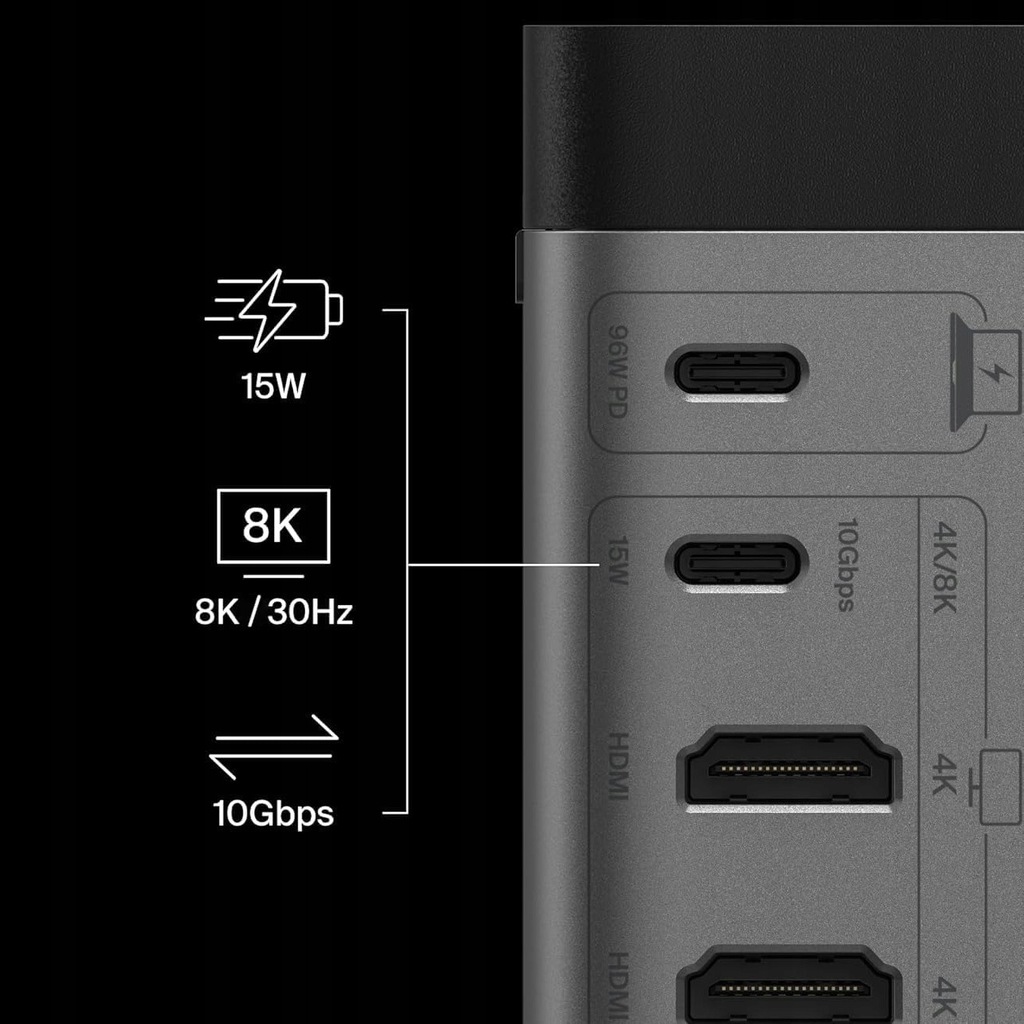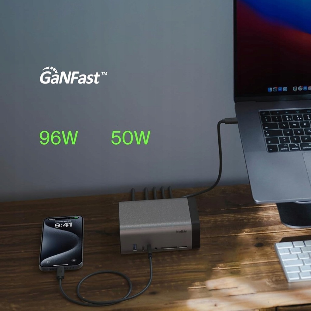- Wbudowany zasilacz GaN zapewnia maks. moc 96W dla laptopa hostującego i 50W dla podłączonych peryferiów
