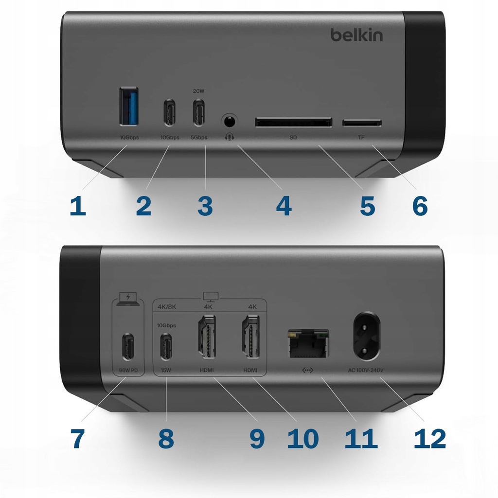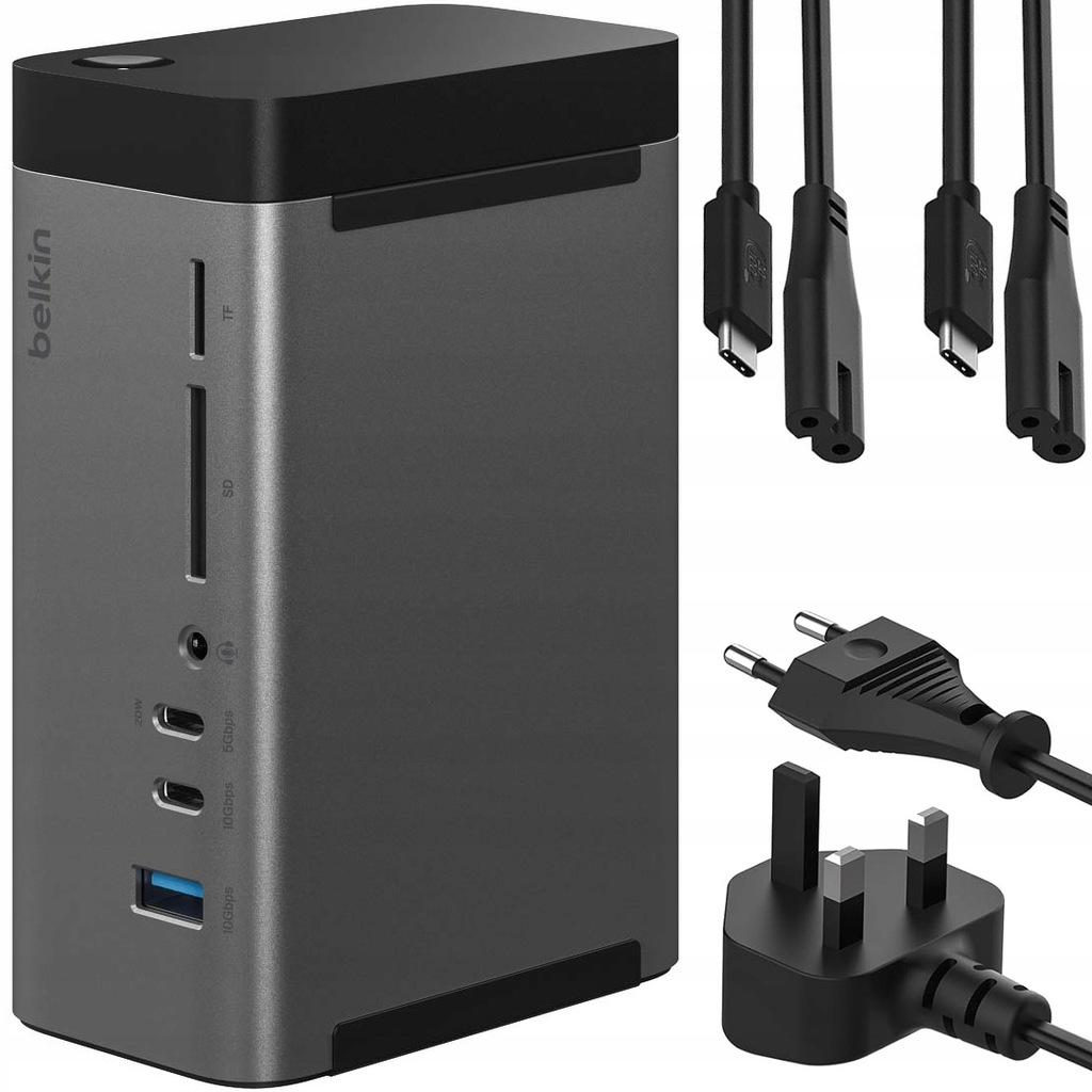 - W opakowaniu: stacja Belkin INC020 z kablem połączeniowym USB-C o długości ok. 1m, i kablem zasilającym (EU oraz UK) o dł. 2m, instrukcja/dokumentacja (pozostałe przedmioty i akcesoria widoczne na zdjęciach przedstawiają jedynie jej funkcjonalność)