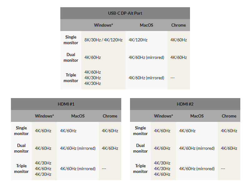 - USB-C DisplayPort™ (Alt Mode): 10Gb/s (5V/3A/15W), 8K/30Hz, 4K/120Hz