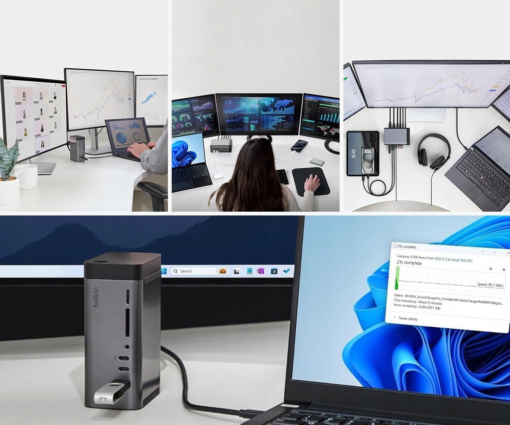 Sporą zaletą stacji jest możliwość podłączenia i korzystania z aż 3 monitorów jednocześnie, co daje ogromne możliwości rozszerzenia stanowiska pracy, jak i ogólnego zwiększenia komfortu pracy.