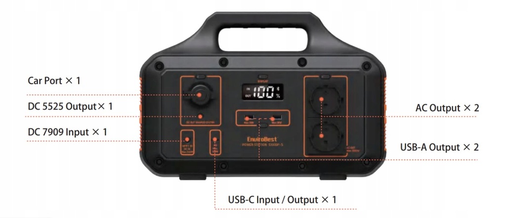 - Połączenie: gniazdo zasilania (220V, 10A), wejście ładowarki samochodowej, 2x wyjście USB-A 18W, 1 x wejście/wyjście USB-C PD100W,