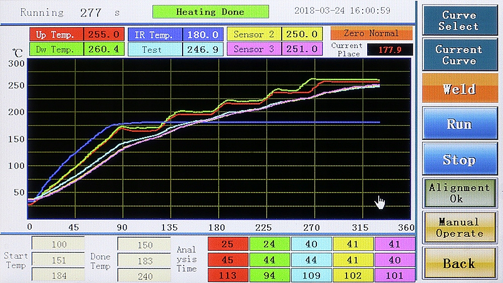 Po skończonym procesie lutowniczym na wyświetlaczu można przeanalizować pełen przebiegu procesu grzania w każdej 3 stref grzewczych i każdego z 6 czujników.
