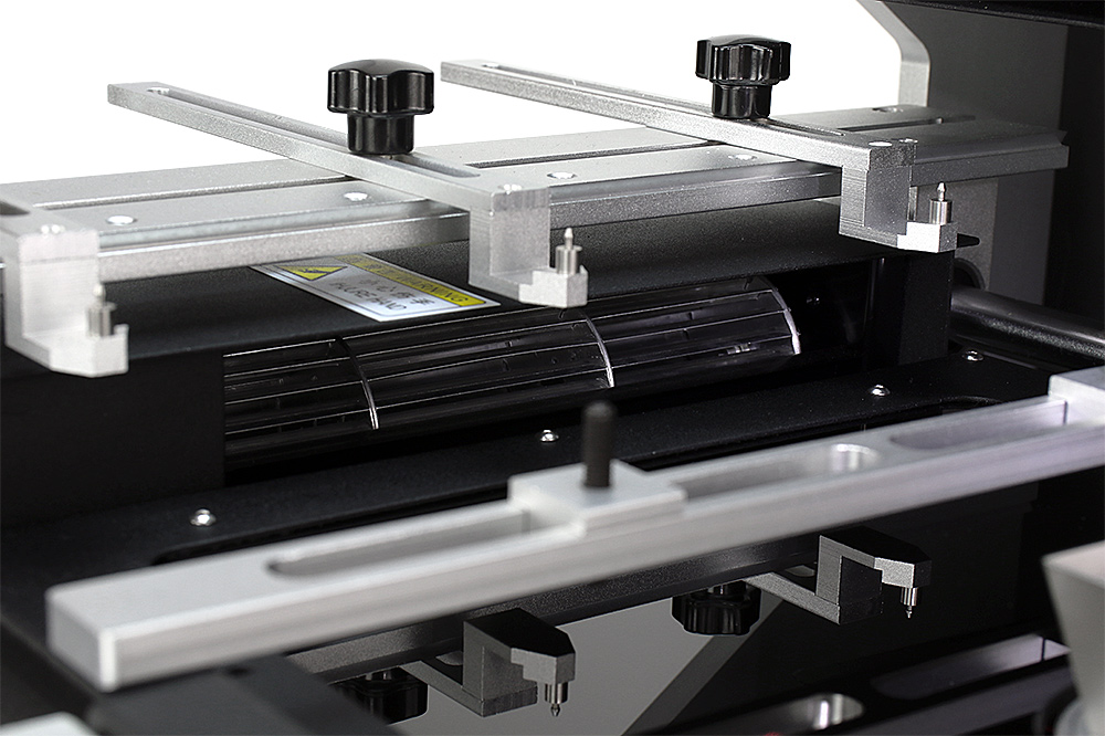 Główny uchwyt płyt PCB został wyposażony w żłobienie typu V co zapewnia szybki i stabilny montaż płyt oraz duży zakres regulacji.