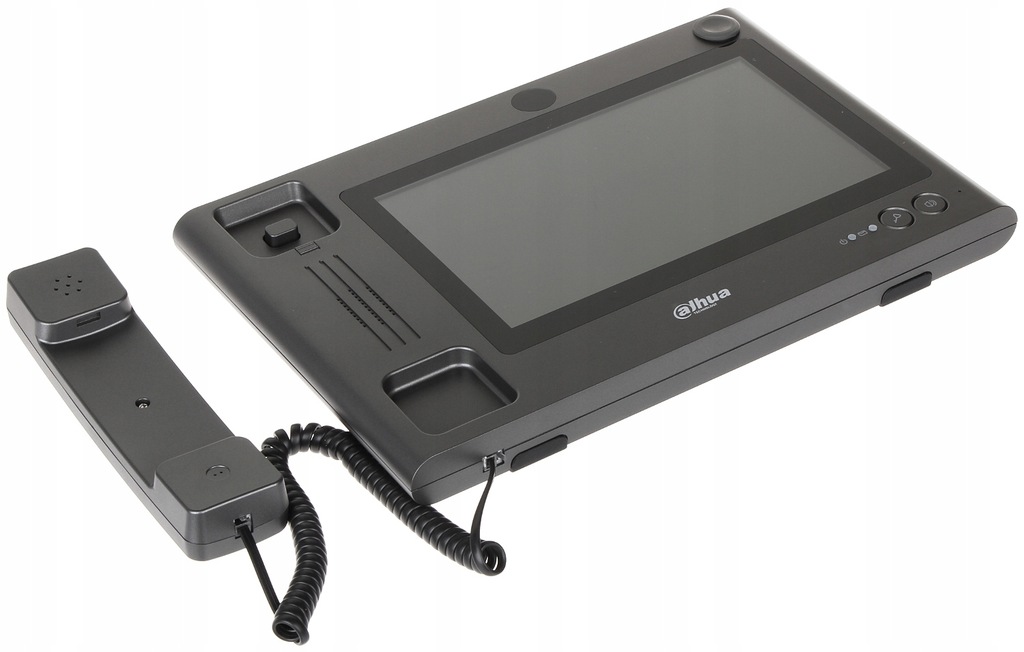 Wbudowany mikrofon, Wbudowane głośniki, Słuchawka z mikrofonem, która może być używana zamiennie z trybem głośnomówiącym, Złącze Hirose 4-pin do przyłączenia zewnętrznego mikrofonu, 1 x USB 2.0 + 1 x USB 3.0, 1 x HDMI - Wyjście wideo, max. 1024 x 600 px, Komunikacja dwukierunkowa - Audio, Płynna regulacja parametrów monitora: jasności obrazu, głośności dzwonka i rozmowy, Współpraca z kamerami IP Dahua, Redukcja szumu i echa, Możliwość bezpośredniej komunikacji między dwoma lub więcej panelami, Obsługa kart Micro SD do 32GB (możliwy zapis lokalny), Port RS-485, Interfejs sieciowy: LAN - 10/100 Base-T, Współpraca z serwerem SIP