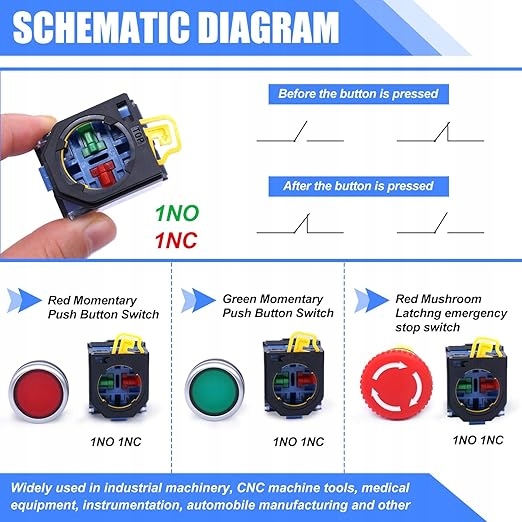 - Uwaga specjalna: Ten przełącznik przyciskowy nie ma funkcji oświetlenia; Nazwa produktu: Przełącznik przyciskowy czerwono-zielony; Tryb: LA38-11; Typ styku: 1NO 1NC; Typ akcji: Chwilowa; Ith: 10A; Ui: 440V