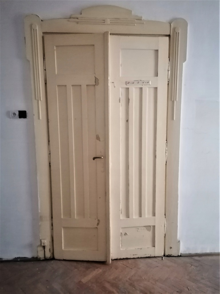 Drzwi, ze względu na swój wiek, posiadają na powierzchni zadrapania, przebarwienia oraz łuszczący się biały lakier, który należałoby usunąć. Ogólnie jednak drzwi są w dobrym stanie. Ze względu na pokaźne wymiary i ładne kształty są wdzięcznym materiałem do spektakularnej renowacji. Drzwi po wyczyszczeniu z pewnością prezentować się będą fantastycznie. Podana cena dotyczy jednej pary. Drzwi do odbioru w Krakowie.