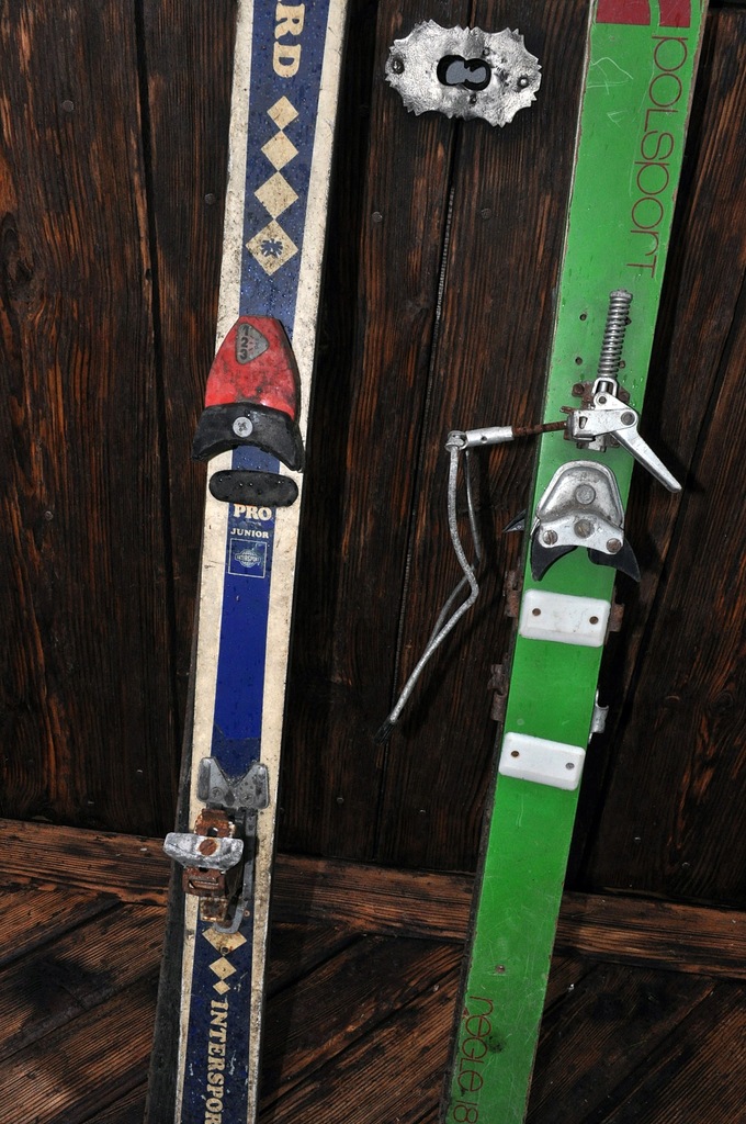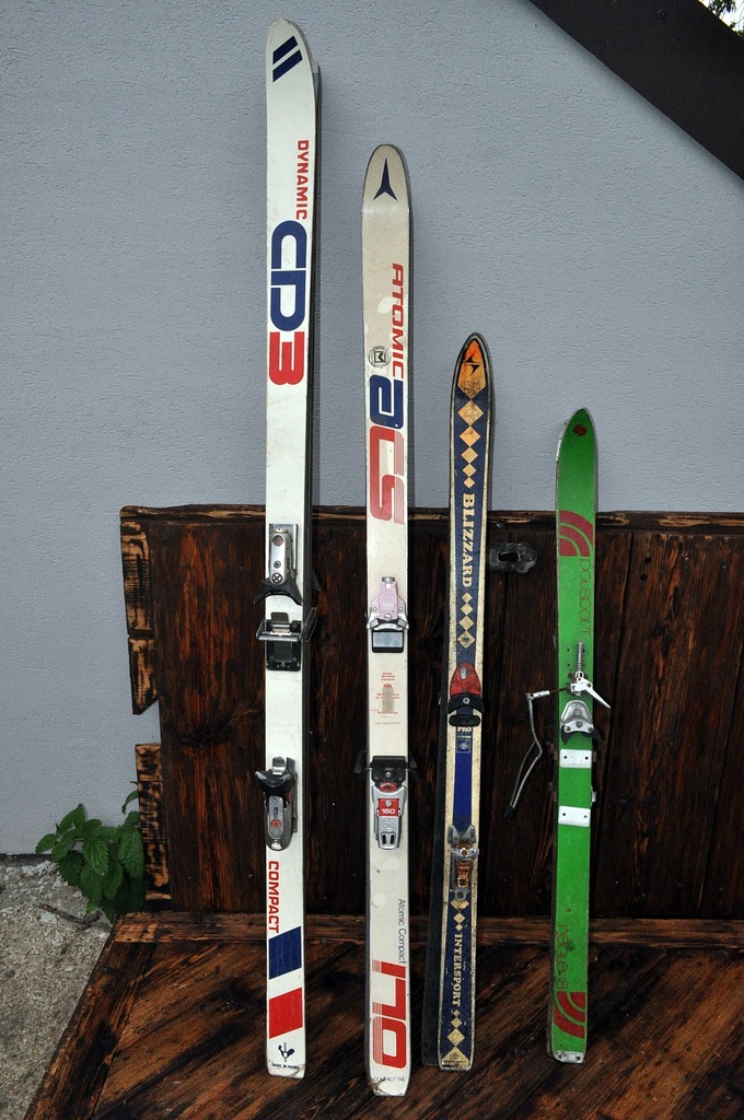 Cztery pary starych nart - ciekawy gadżet dla wypożyczalni lub ozdoba pomieszczenia. Jedna para produkcji francuskiej Dynamic Compact o długości 185 [cm], druga Atomic Compact o długości 170 [cm], trzecia Blizzard , czwarta Polsport Regle 18.