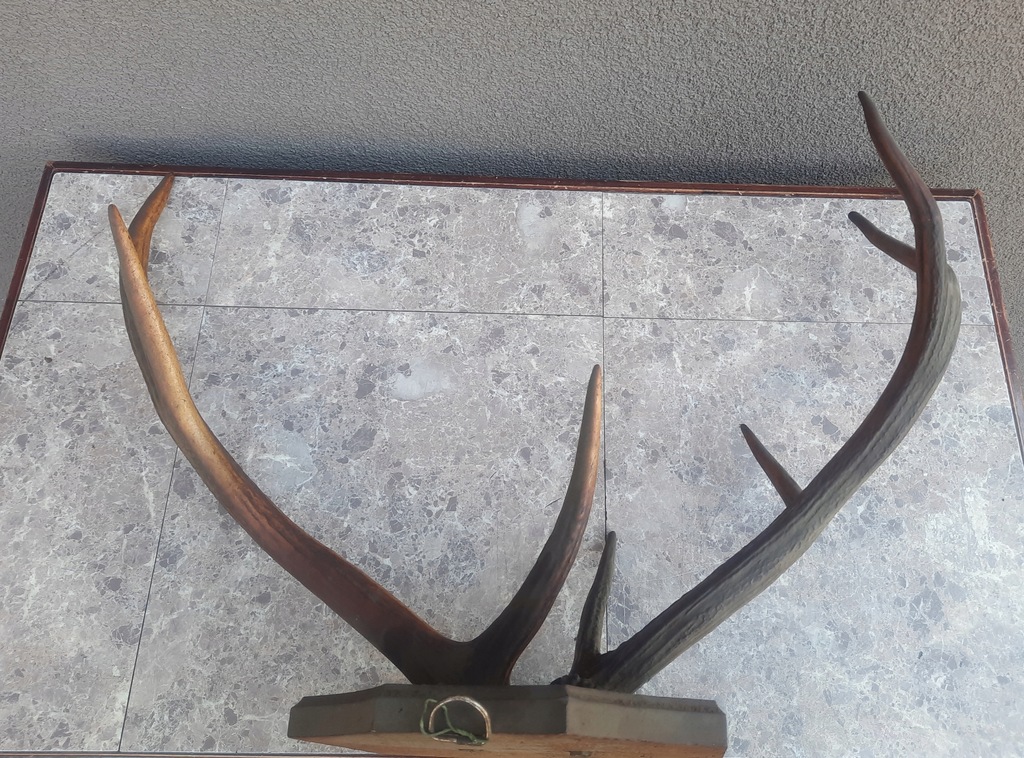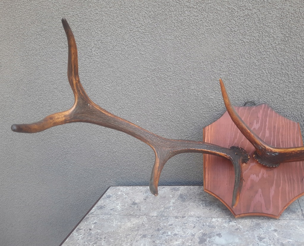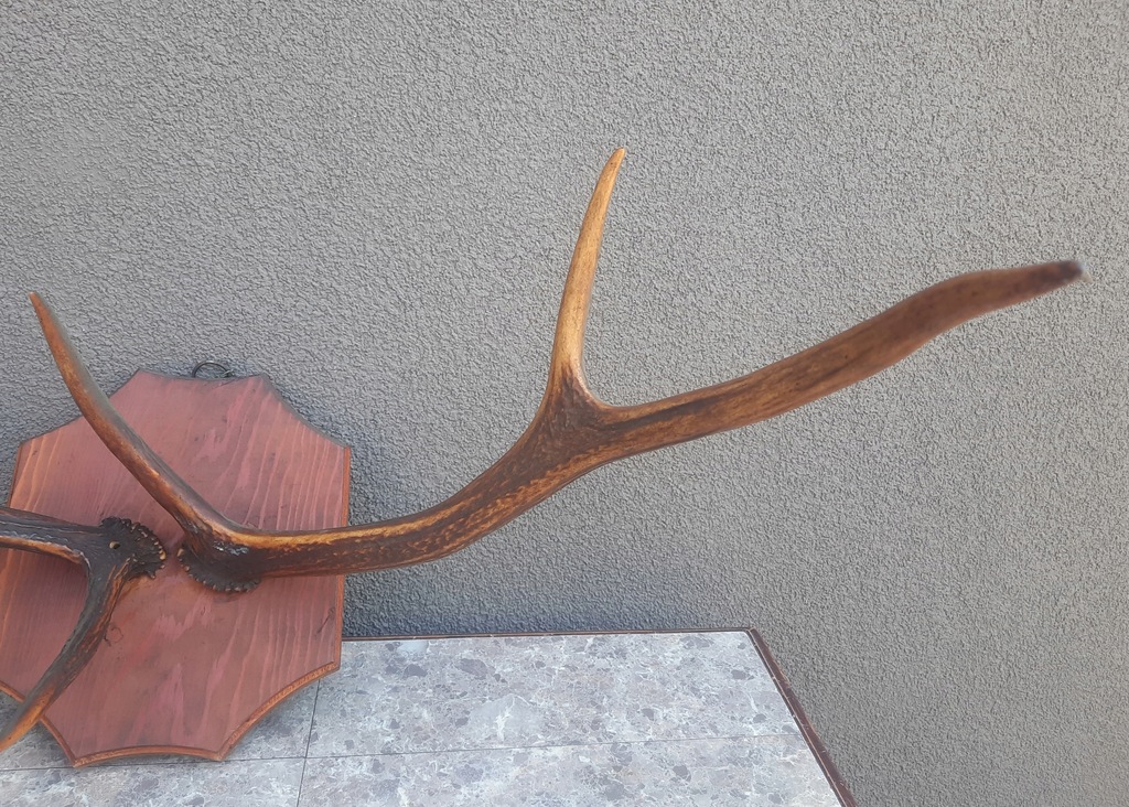 Do sprzedania stare poroże jelenia, zamontowane na desce gotowe do zawieszenia, długość 43cm i 50cm, deska 20x24cm, do wysyłki zostaną odkręcone od deski