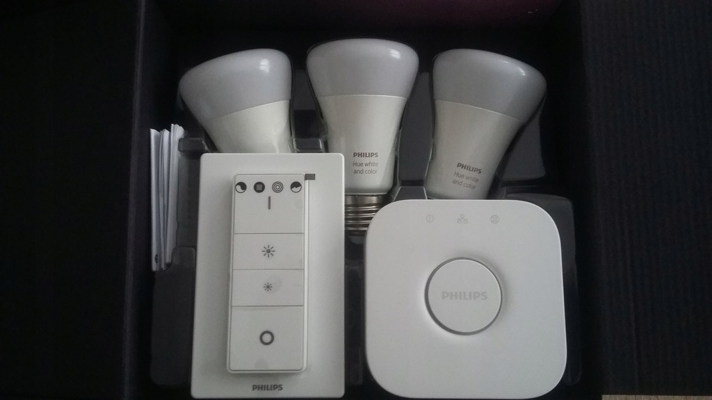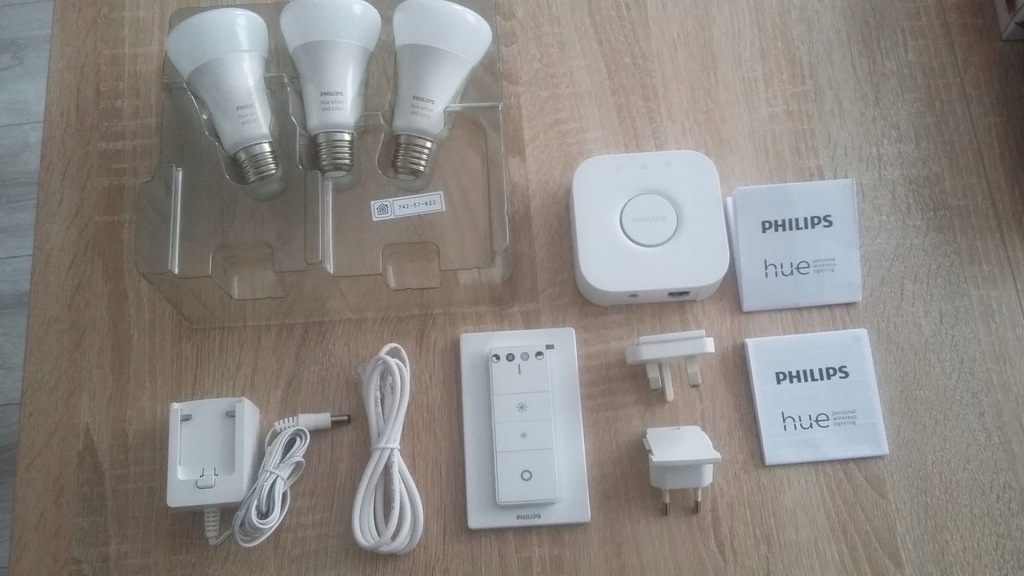 - Zestaw zawiera: 3 żarówki LED HUE o mocy 10 W i gwincie E27, mostek, kabel sieciowy Ethernet, zasilacz, regulator przyciemniania Hue