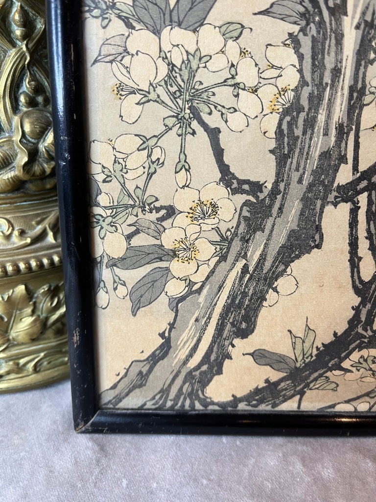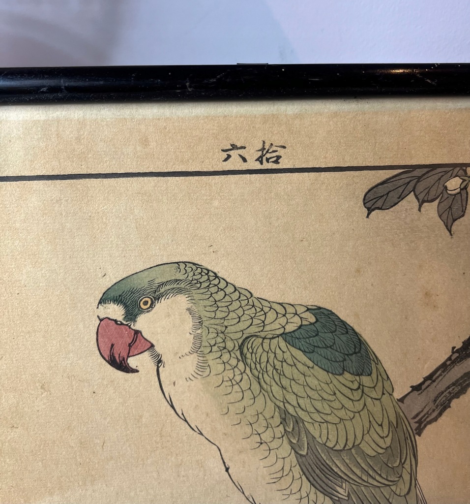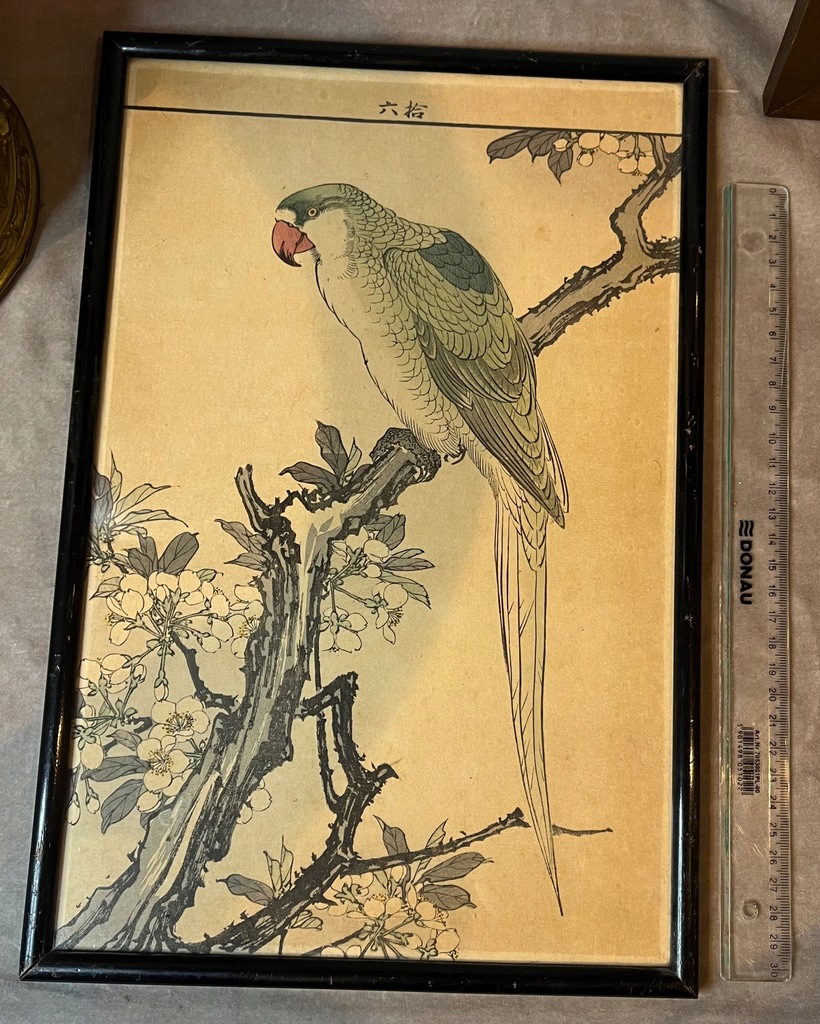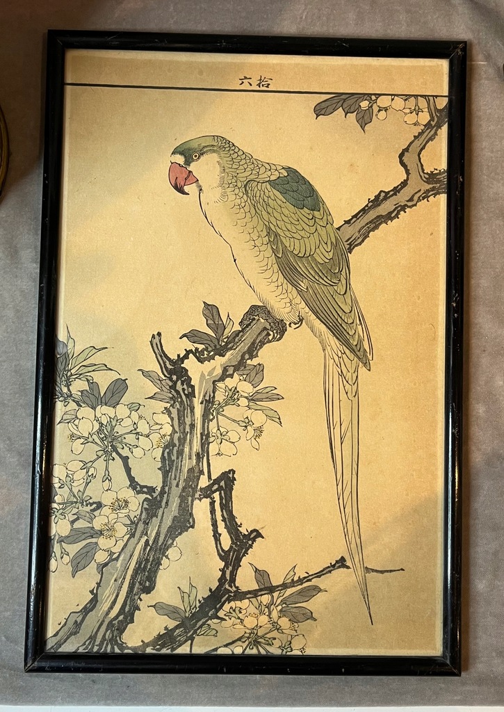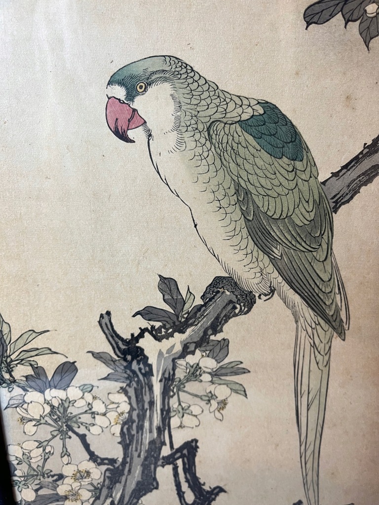 Stary obrazek papuga Imao Keinen Japanese plum, Red breasted Parakeet (15045249305)