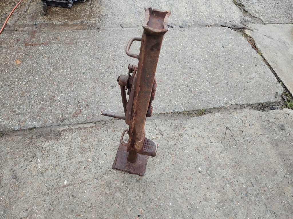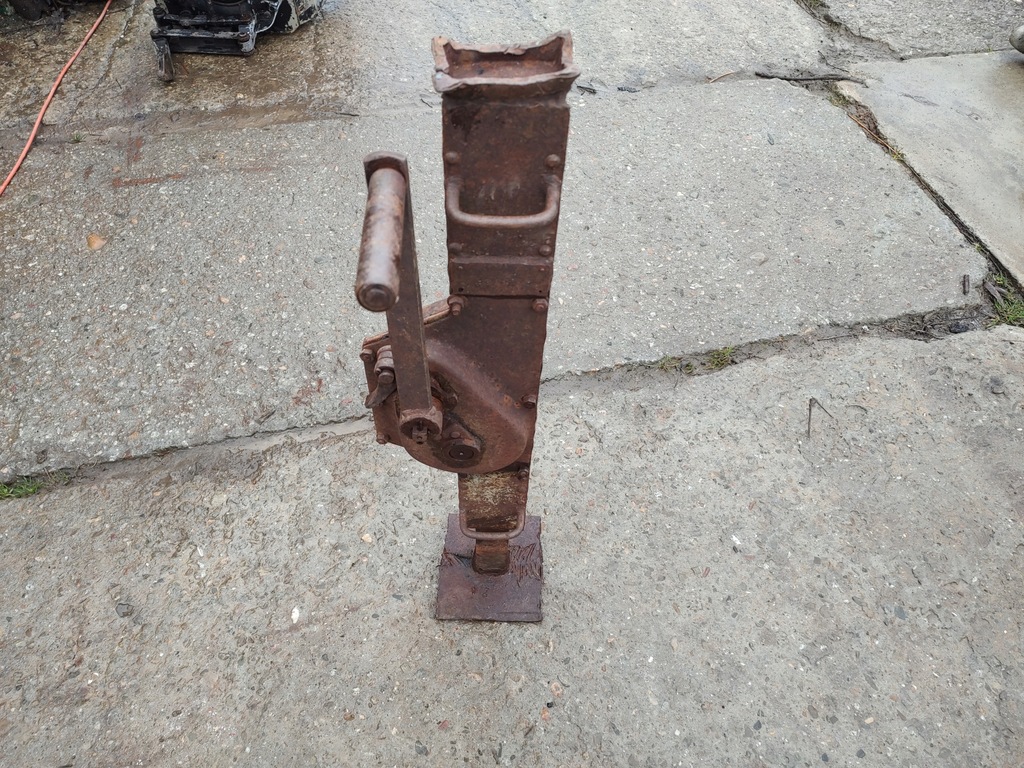 Podnośnik w dobrym stanie podnosi i obniża się. Korba z blokadą w dobrym stanie nadaje się do użytku lub na ozdobę, kręci w górę i w dół. Reszta elementów podnośnika jest nitowana lub skręcana. Stan do lekkiej renowacji.