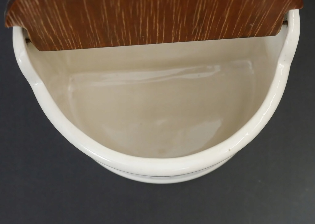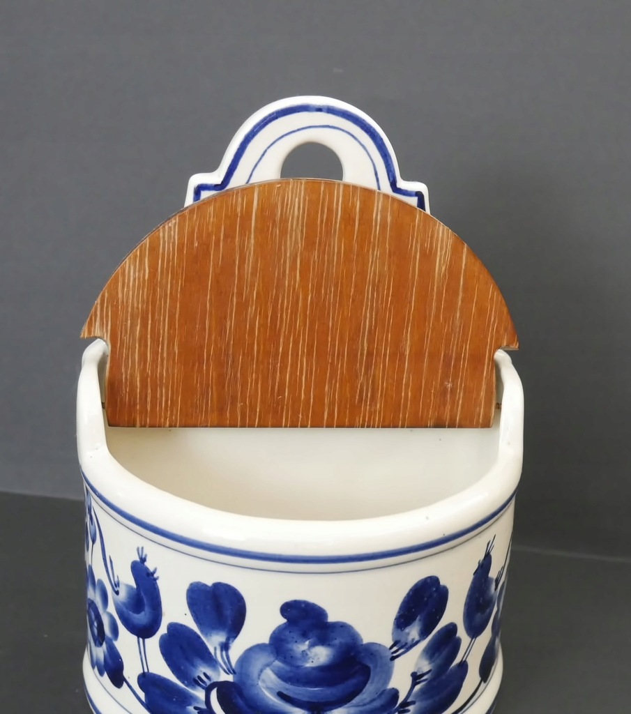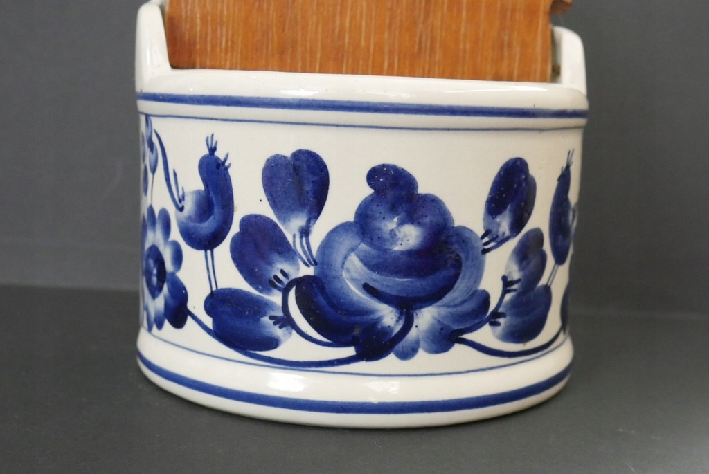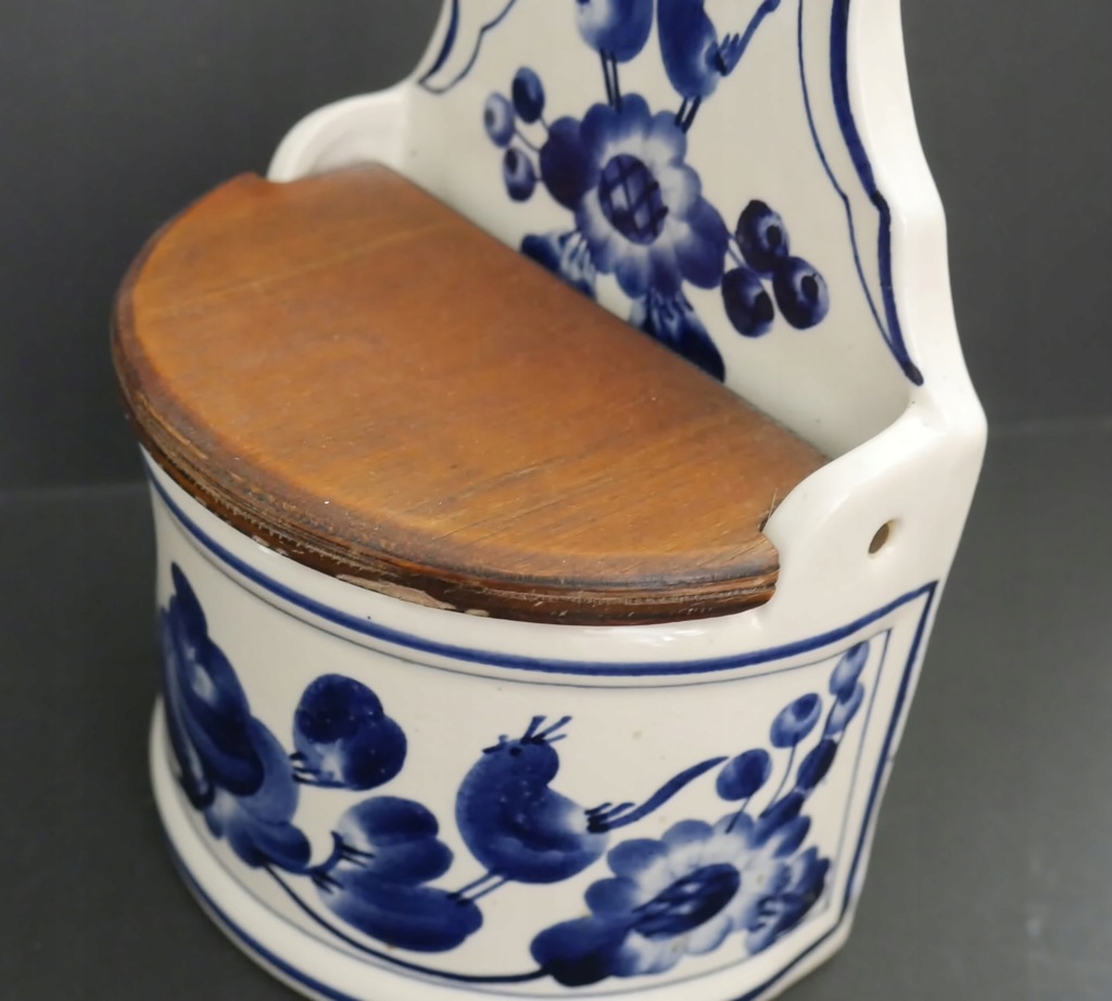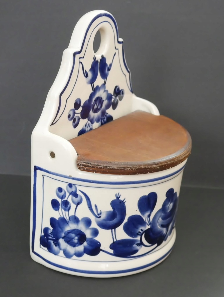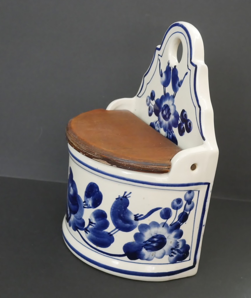 stary, ceramiczny ,dopoweszenia pojemnik na sół,malowany,drewniana(sklejka) pokrywka