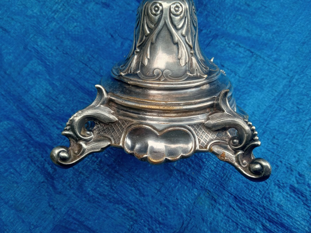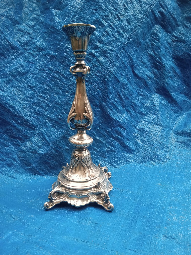 wysokość 30,5 cm , podstawa 12,5 cm x 12,5 cm , niewielkie przetarcia srebrzenia , świecznik jest trochę skrzywiony - widać to na zdjęciu numer 6