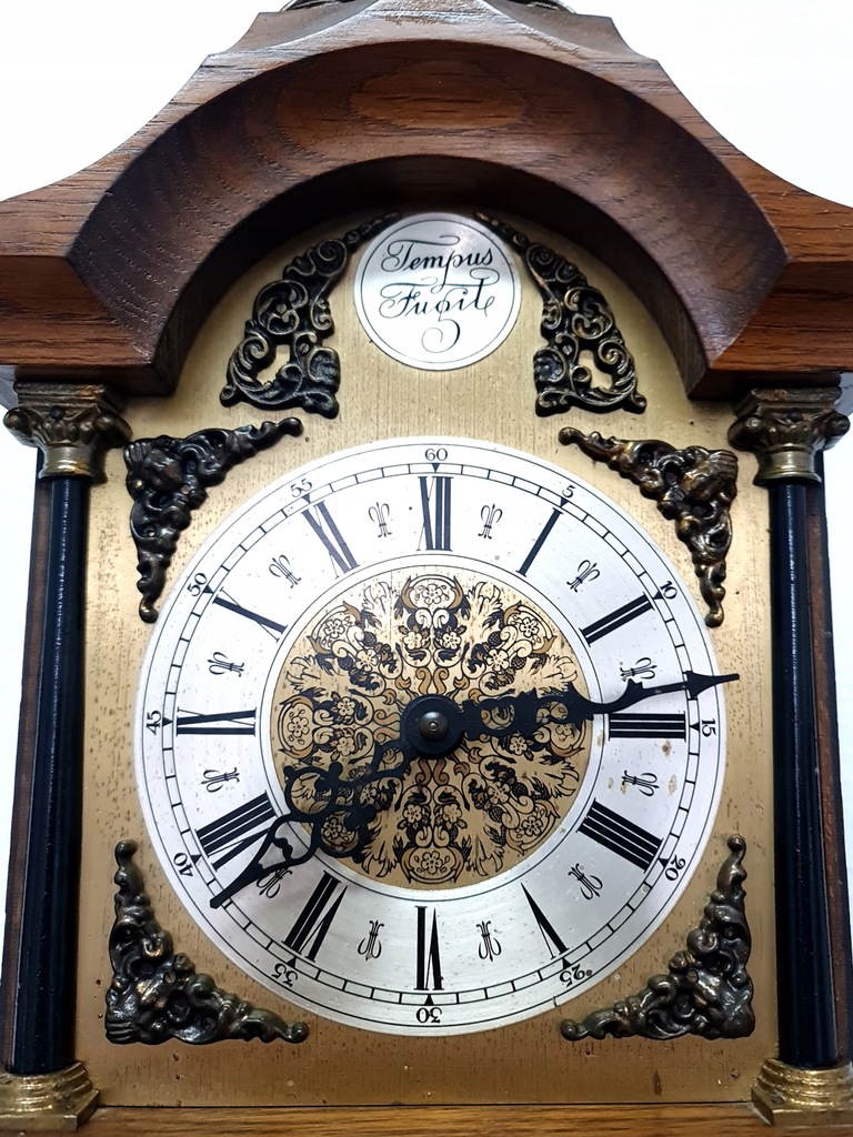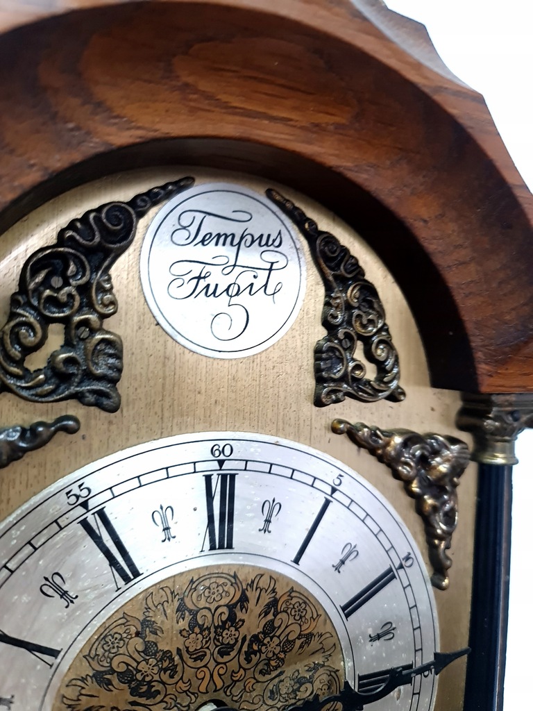 Zdobiona, mosiężna tarcza w nienagannym stanie z łacińską sentencją - tempus fugit - czas ucieka.