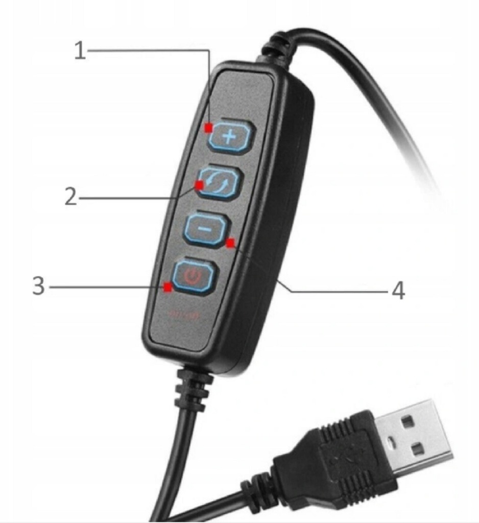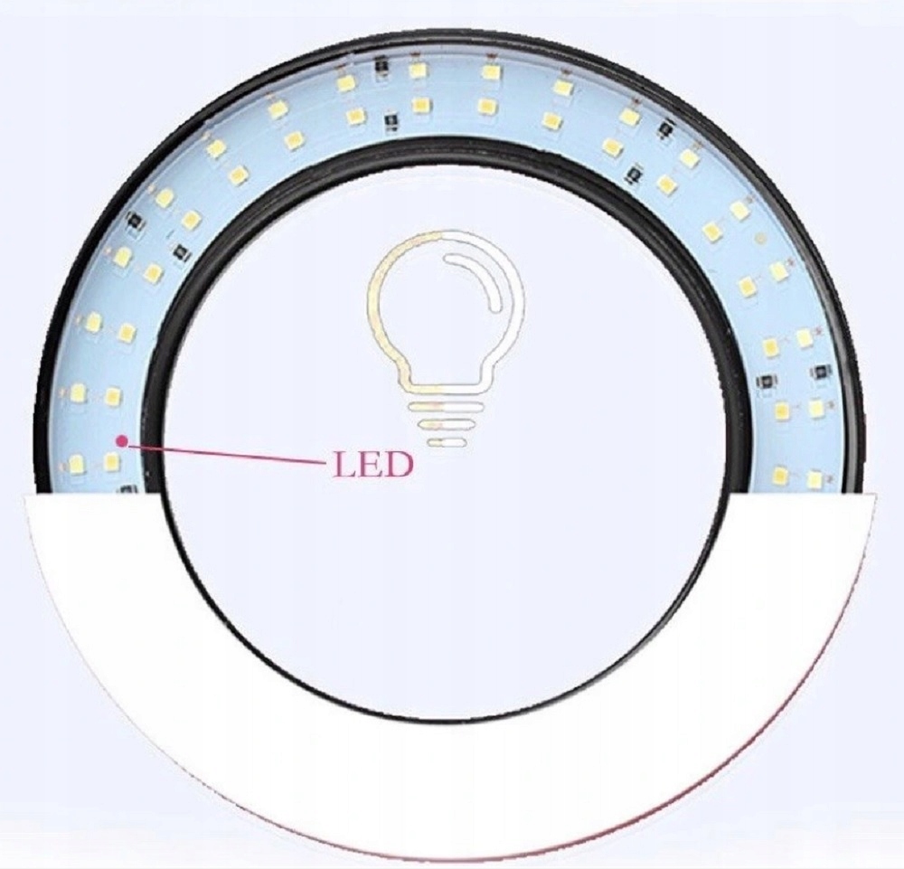 - Lampa pierścieniowa z wbudwowany pilotem posiada dziesięcio-stopniową regulację mocy oświetlenia, oraz trzy rodzaje barwy światła (ciepła, zimna oraz mieszana),