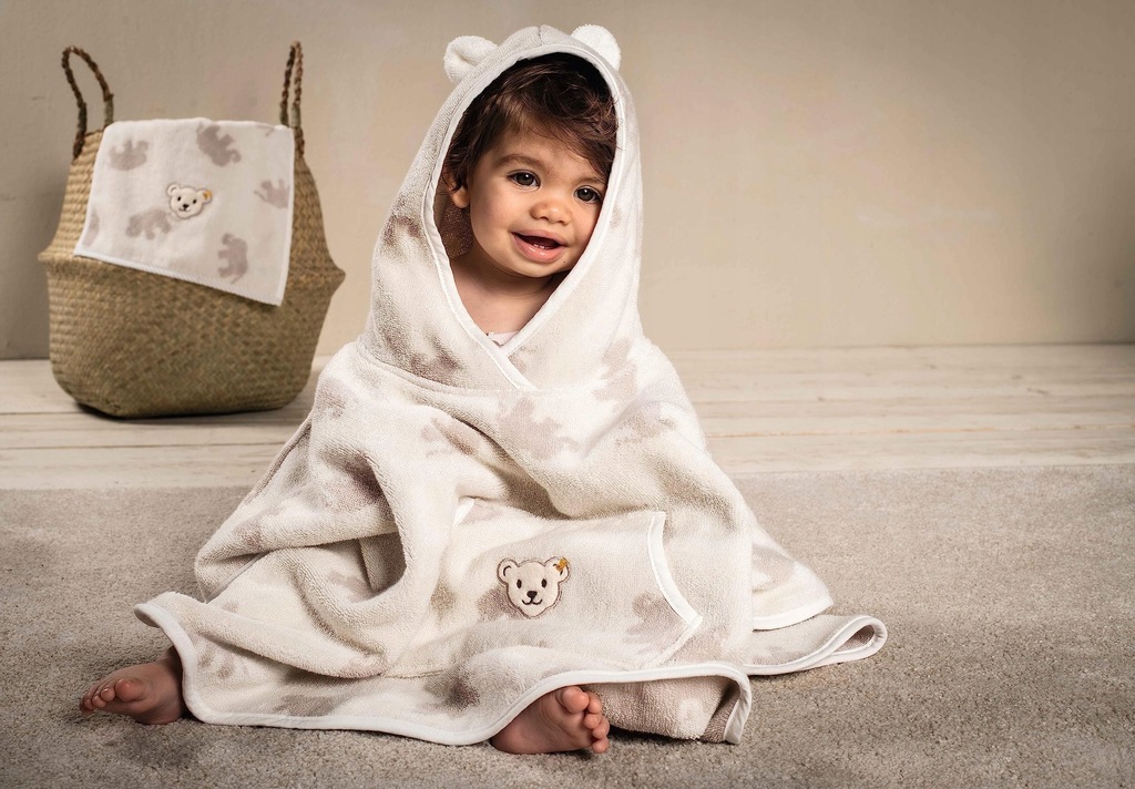 - Rozmiar uniwersalny 68 x 50 cm bez kaptura. Delikatna biel pasuje do każdej łazienki. Idealny również jako pomysł na prezent. Z puszystym motywem misia Steiff