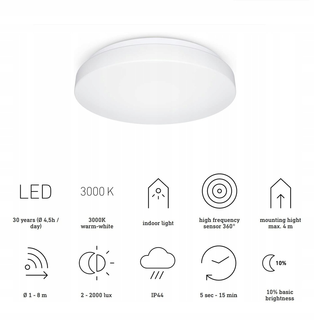 - punkt znaku wypunktowania: Optymalne oświetlenie - Wydajny system oświetleniowy LED o mocy 9,4 W lampy sufitowej w połączeniu z rozproszoną maską z tworzywa sztucznego zapewnia jasność 942 lm i ciepłobiałą barwę światła 3000 K dla jednolitego wzoru świetlnego w piwnicy, korytarzu, klatce schodowej i strefie wejściowej., Bezproblemowe wykrywanie ruchu - Niewidoczny czujnik 360° RF reaguje na ruch w zasięgu 1-8 m, a także wykrywa przez drewno, szkło i lekkie ściany., Indywidualne ustawienia - zasięg, czujnik zmierzchowy (2 - 2000 lx), czas świecenia (5 s - 15 min) i światło podstawowe (10/30 min, cała noc) ustawiane za pomocą pokrętła, łącznie z eleganckim łagodnym startem światła i opcją 4-godzinnego światła ciągłego, Proste łączenie w sieć - W celu równoległego przełączania oprawę ścienną LED do wnętrz można po prostu połączyć kablem z maks. 10 innymi lampami LED, tworząc grupy oświetleniowe., Zakres dostawy: materiał montażowy (3x śruby, 3x kołki, 3x podkładki dystansowe), instrukcja obsługi | Wymiary (Ø x H): 280 x 110 mm | Waga: 0,44 kg | Przyłącze sieciowe: 220 - 240 V / 50 - 60 Hz | Numer artykułu: 079734