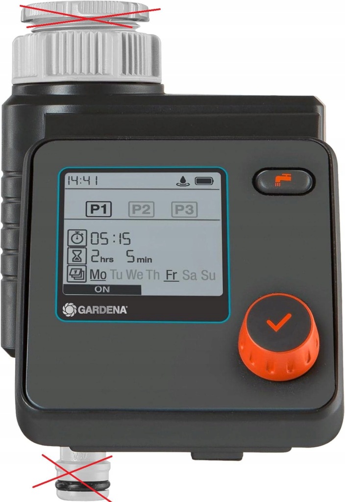 Podlewaj teraz: ręczne podlewanie np. wodą. B. napełnienie wiadra jest możliwe w dowolnym momencie i bez konieczności odłączania sterownika za naciśnięciem przycisku