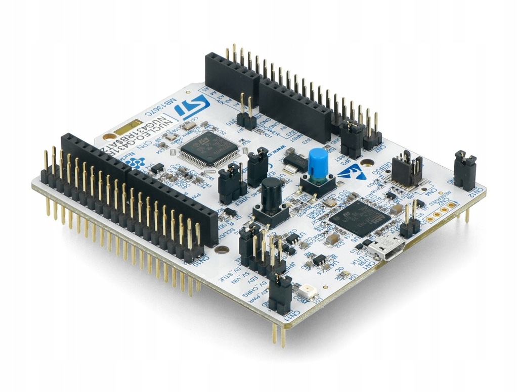 Moduł STM32 Nucleo z 32-bitowym mikrokontrolerem STM32G431RB, który został wyposażony w rdzeń Arm Cortex-M4 o taktowaniu 170 MHz, 128 kB pamięci Flash oraz 32 kB SRAM. Płytka należy do rodziny Nucleo-64 dzięki czemu poza kompatybilnością z platformą mbed, posiada złącza umożliwiające podłączenie nakładek przystosowane do pracy z Arduino Uno oraz wyprowadzenia ST Morpho, które dają dostęp do wszystkich pinów GPIO mikrokontrolera.