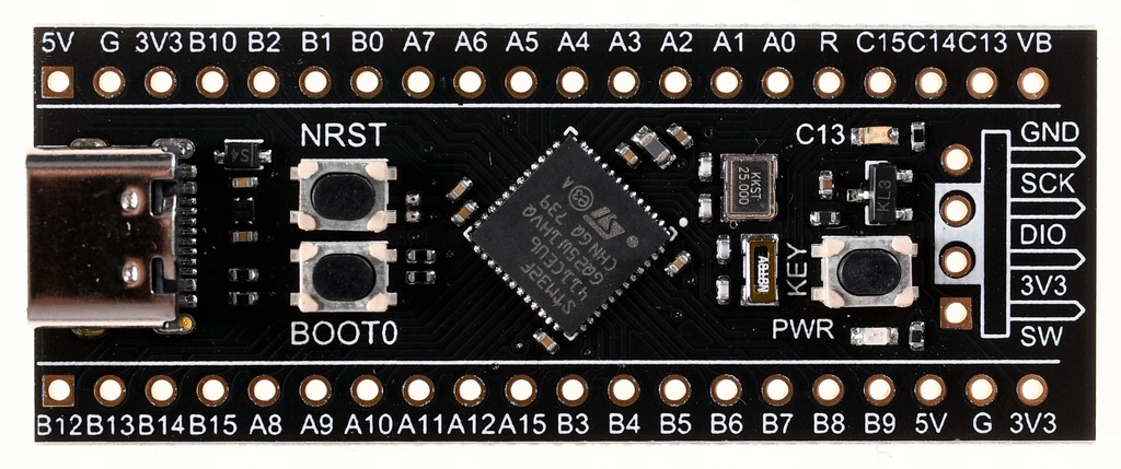 Dla pisania aplikacji możemy wybierać z naprawdę sporej ilości środowisk. Oprócz IDE developerskich polecanych przez STMicroelectronics, układ jest w pełni kompatybilny z Arduino. Do tego mamy częściowe wsparcie Mbed oraz Micropython. Dla wygody użytkowników, Black Pill został również wyposażony w port USB-C, przez który możemy komunikować się z procesorem jak i zasilać całą płytkę. Oczywiście możemy również zaprogramować układ poprzez interfejs SWD/JTAG oraz port szeregowy.