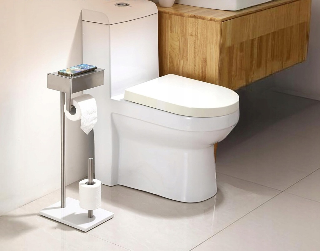 Zadbaj o porządek i styl w swojej łazience z — stojącym uchwytem na papier toaletowy z pudełkiem na chusteczki nawilżane. Koniec z nieestetycznie leżącymi opakowaniami — teraz wszystko jest dyskretnie schowane, zawsze pod ręką i wygląda elegancko.