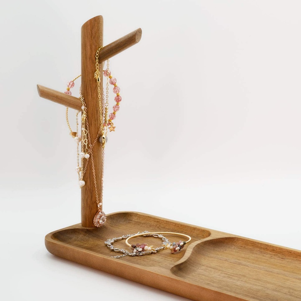 Duża pojemność: Nowoczesna taca na biżuterię z litego drewna drzewa, o wymiarach 10 x 4 3/4 x 9 1/2 cali (długość, szerokość i wysokość). Wykonane z drewna orzechowego.