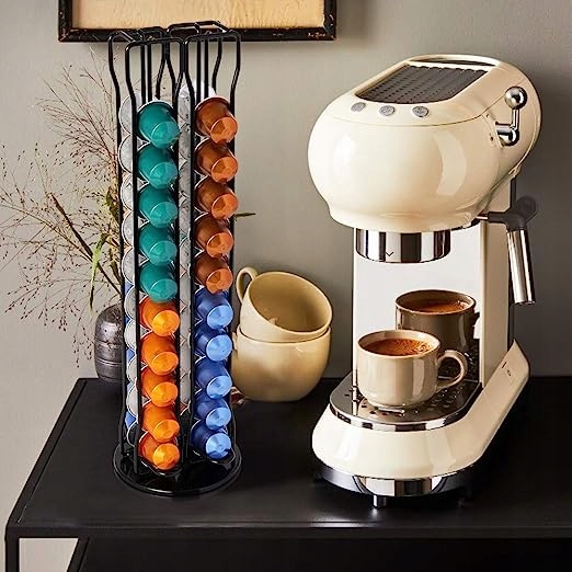 Konstrukcja oszczędzająca miejsce: ten stojak na kapsułki ma pionową strukturę i zajmuje bardzo mało miejsca na blacie. To idealne rozwiązanie do przechowywania w małej kuchni lub salonie.