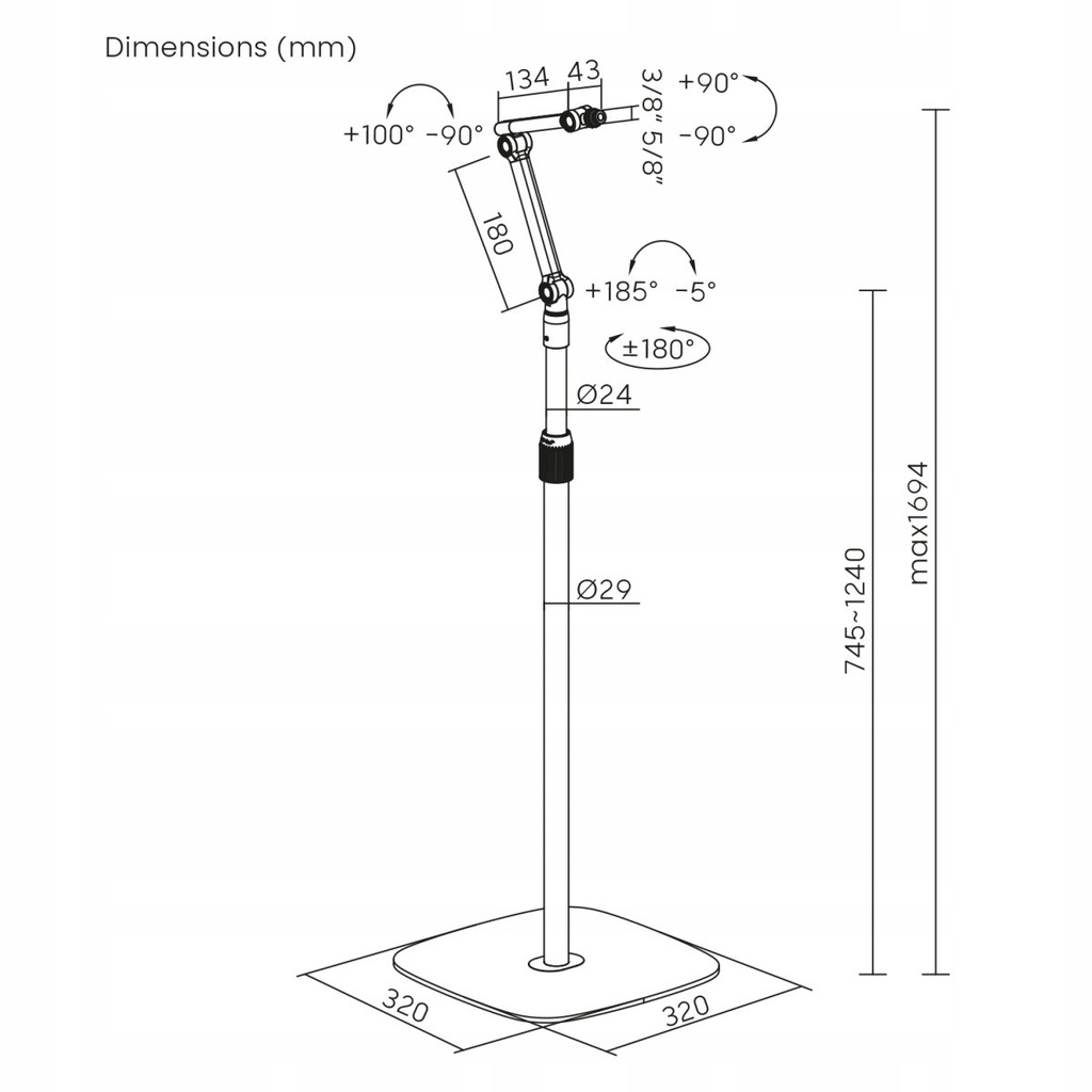 - Pozostałe parametry: Producent: Maclean Model: MC-337 Materiały wykonania: metal, tworzywo sztuczne, aluminium Wymiary: 320 x 320 x 1694 mm Maksymalne obciążenie: 1 kg Uchwyt z gwintem 3/8 " i 5/8 " Regulacja nachylenia mikrofonu: od -90° do +90° Regulacja obrotu: 180° Regulowana wysokość: 626-1694 mm Profesjonalny stojak na mikrofon charakteryzujący się wysoką stabilnością i solidną konstrukcją Przeznaczony do mikrofonów o wadze do 1 kg Z gwintem 3/8 " i 5/8 " Pasuje do większości popularnych mikrofonów Bardzo łatwy montaż Regulowana wysokość: 626-1694 mm