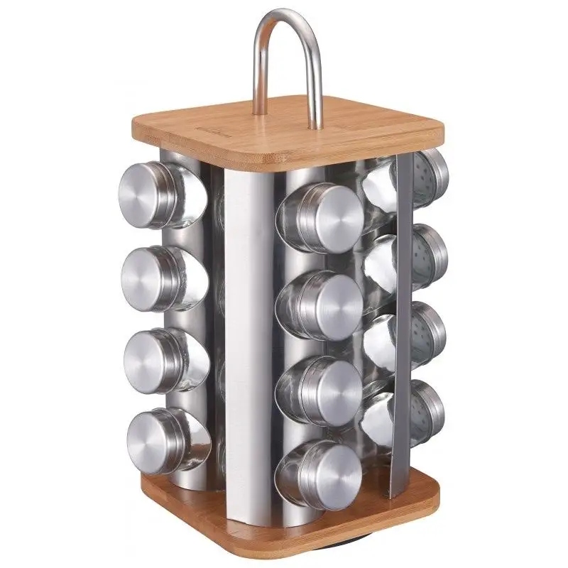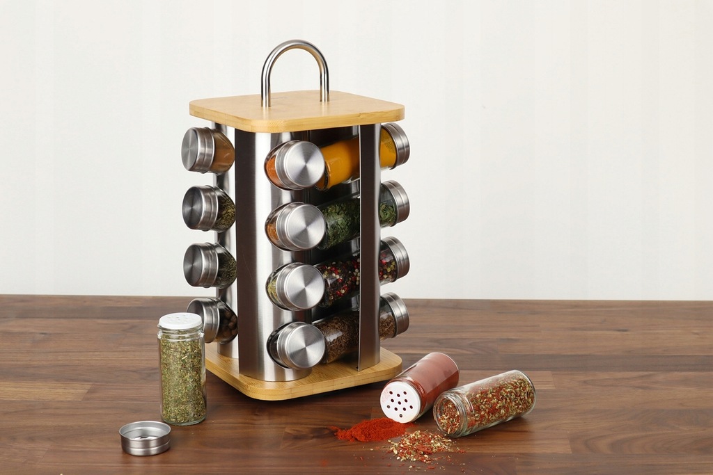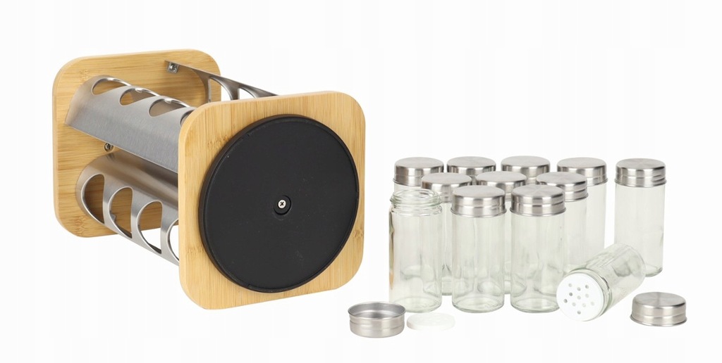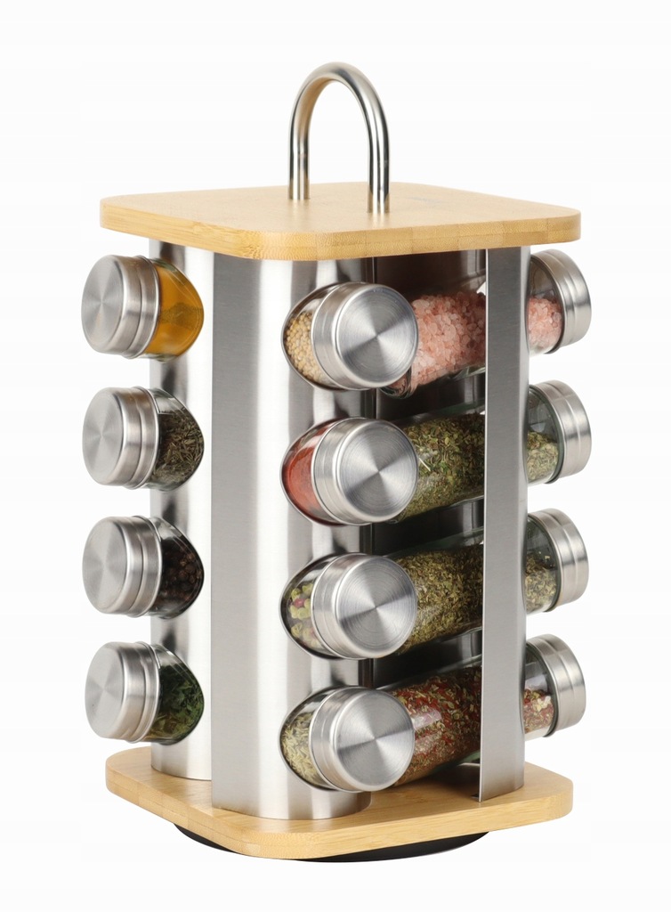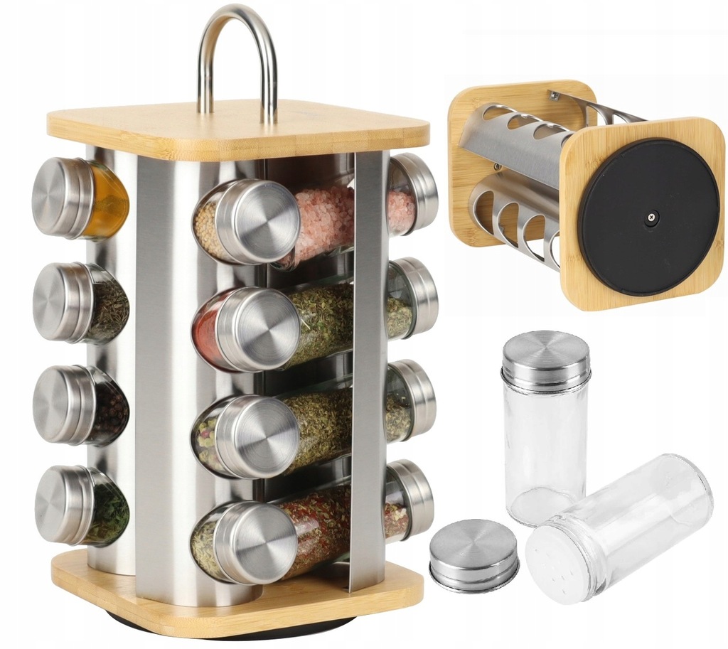 Zestaw 16 pojemników szklanych na obrotowym stojaku z bambusa wykonany ze stali Pojemniczki wykonane z grubego szkła, zamykane kapslem stalowym. Pod kapslem znajduje się zatyczka z dziurkami służąca do posypywania. Stojak obraca się na obrotowej podstawie wokół własnej osi 360 st. Posiada stalowy uchwyt do przenoszenia.