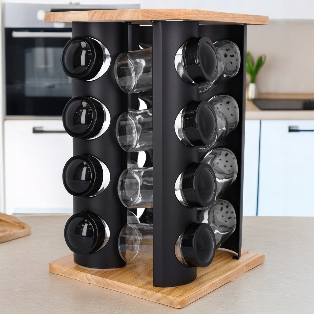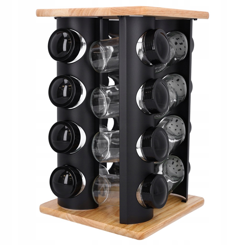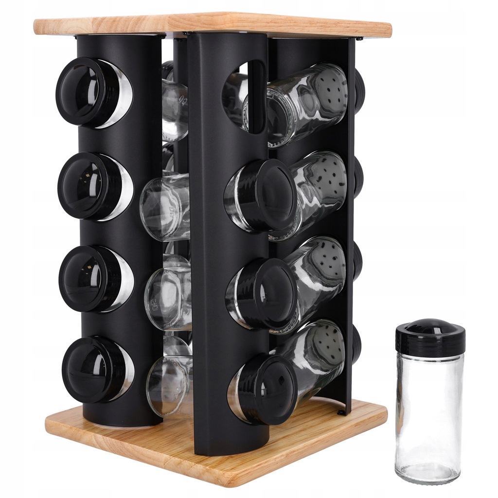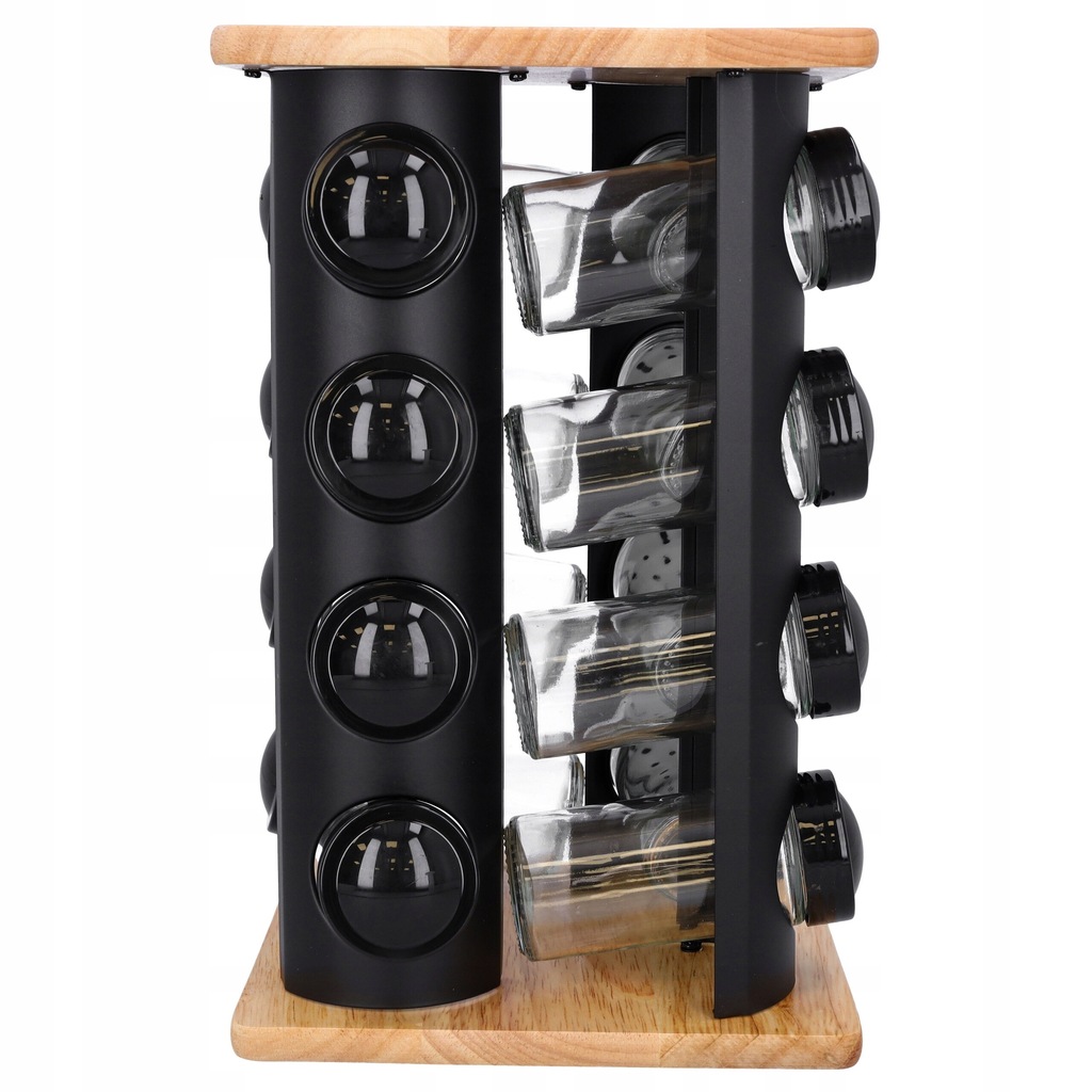 Szukasz praktycznego i stylowego rozwiązania do przechowywania przypraw? Ten obrotowy stojak na przyprawy to doskonały wybór! Drewniano-metalowa konstrukcja w czarnym kolorze zapewnia trwałość i elegancki wygląd, a 16 szklanych pojemników z dozownikami pozwala na wygodne przechowywanie przypraw, zachowując ich aromat na dłużej.