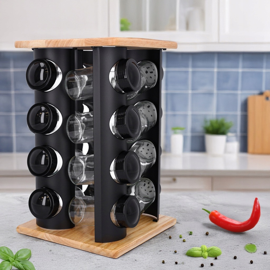 ✔ 16 szklanych pojemników – przechowywanie wielu przypraw w jednym miejscu