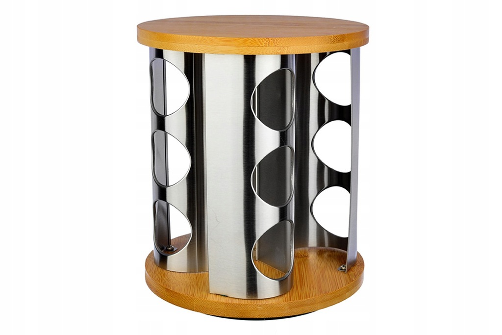 Obrotowy stojak ze stali nierdzewnej z podstawą oraz wierzchem z drewna bambusowego na 12 pojemników z przyprawami.