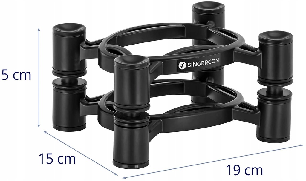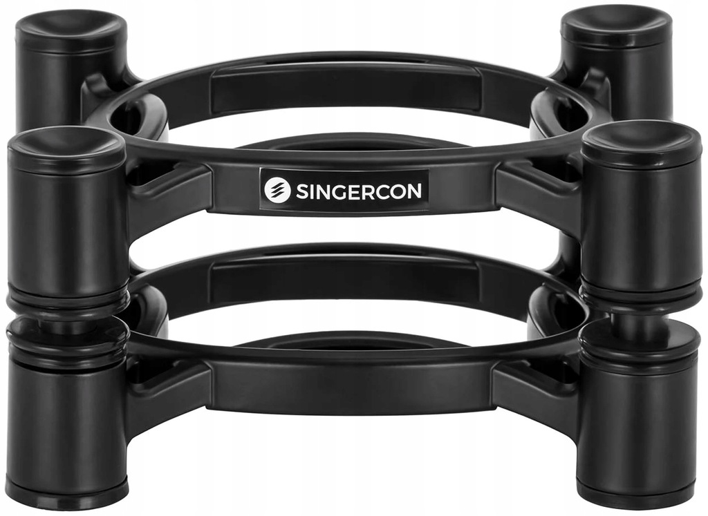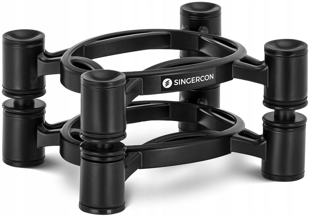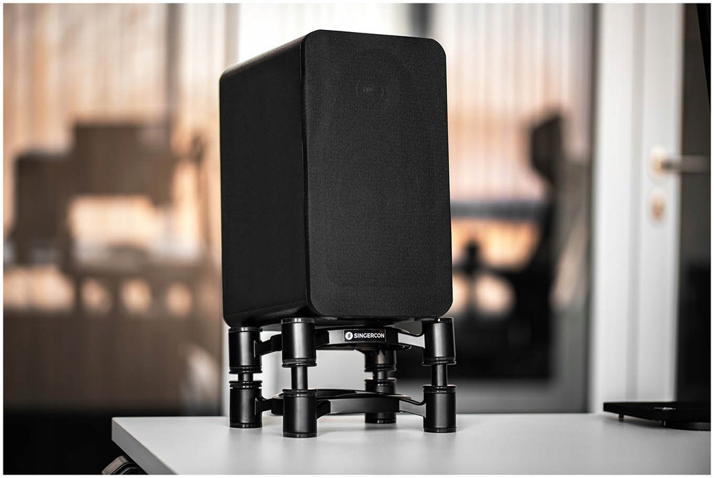 Statyw na głośnik marki Singercon gwarantuje optymalny dźwięk. Jest pochylany i regulowany, sprawdzi się więc idealnie w sali prób, w studiu muzycznym, czy w prywatnym kinie domowym. Izolator minimalizuje przenoszenie drgań na powierzchnię nośną oraz ich odbicia przez obudowę głośnika. Podstawa została zaprojektowana tak, aby cała energia pozostawała w linii ze stożkami głośnika. Szeroki zakres regulacji stojaka pozwala optymalnie skierować dźwięk w stronę słuchacza. W statywie można ustawić wysokość i kąt nachylenia. Regulowany zakres wysokości 100 - 130 mm i nachylenie < 10° gwarantują doskonały dźwięk w każdym pomieszczeniu. Platforma o wymiarach 19 x 15 cm i maksymalnej ładowności do 10 kg pozwalają na szeroki zakres zastosowań. Wykonanie z tlenku glinu z elementami silikonowymi wyróżnia się dużą stabilnością i długą żywotnością.