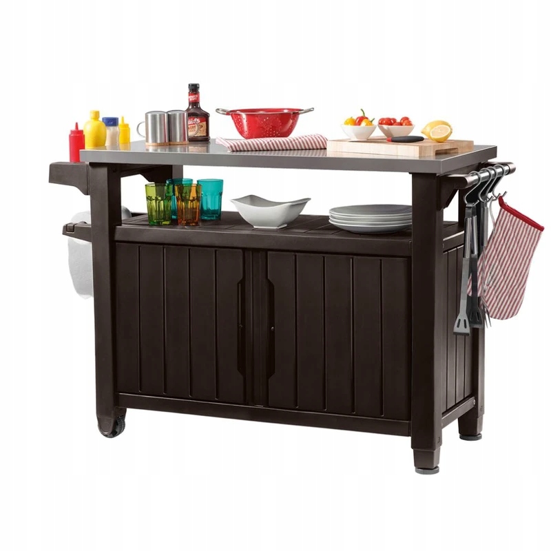 Nowoczesna mobilna szafka, którą szczególnie docenisz podczas grillowania! Pojemna szafa z podwójnymi drzwiami wyposażona w funkcjonalny blat ze stali nierdzewnej oraz praktyczny uchwyt z wieszakiem na ręczniki, sprawdzi się podczas ważnych rodzinnych spotkań na tarasie czy w ogrodzie.