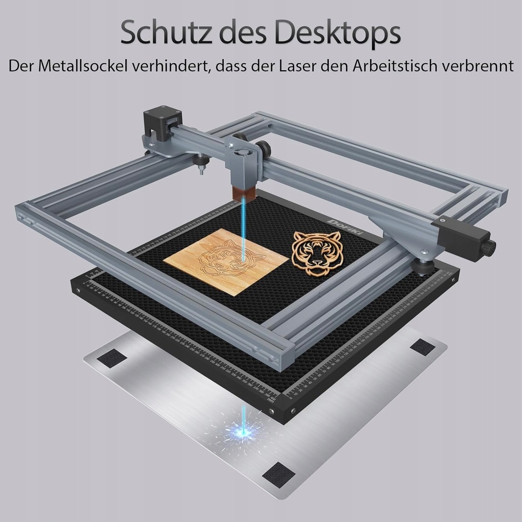 - Ochrona biurka: W zestawie znajduje się aluminiowa metalowa taca, którą można umieścić pod rusztem, aby chronić powierzchnię stołu lub stołu warsztatowego i wychwytywać wszelkie zanieczyszczenia powstałe podczas cięcia.