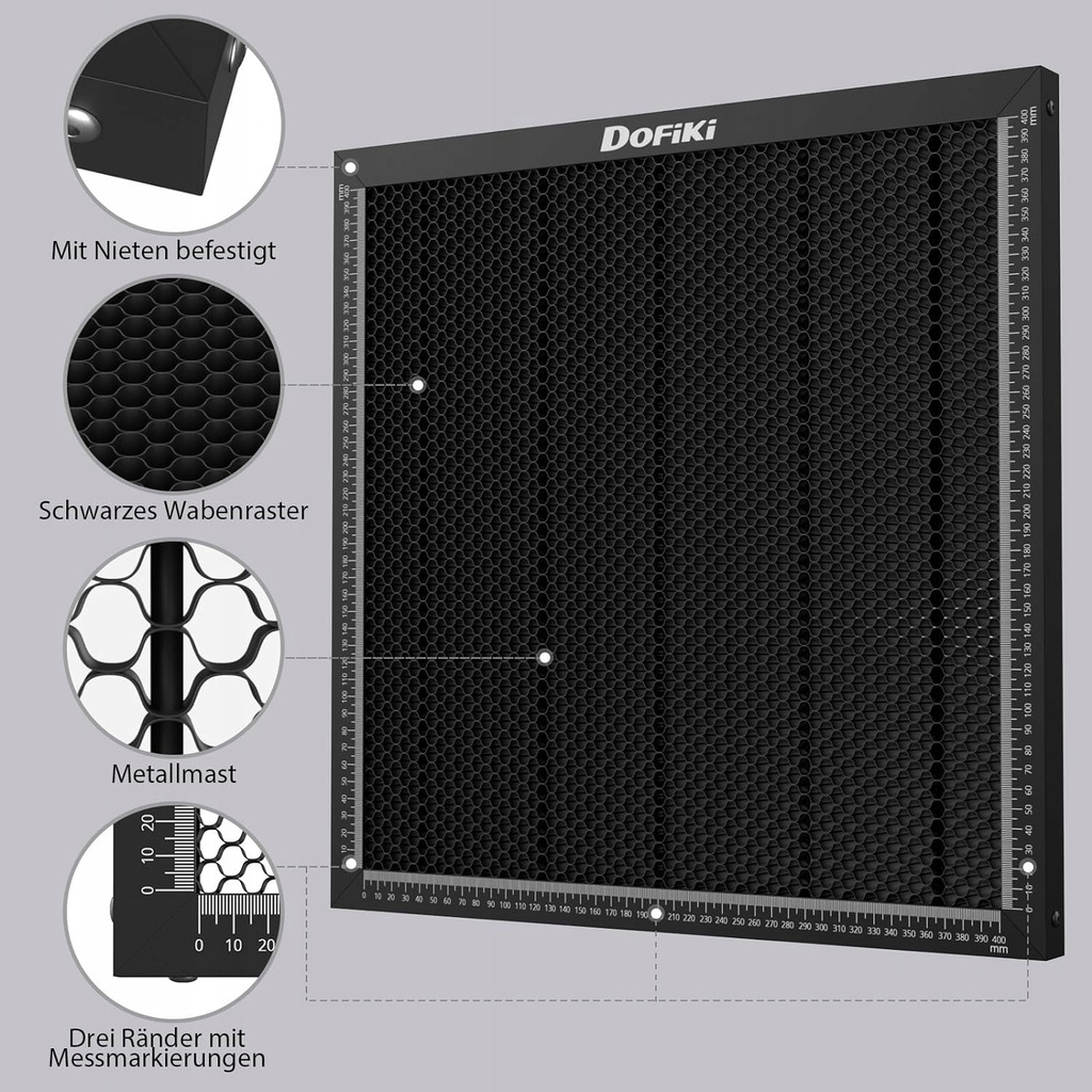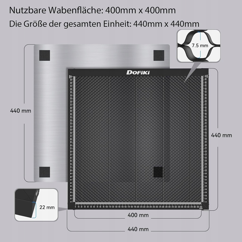 - Rzeczywisty rozmiar: Powierzchnia użytkowa plastra miodu 400 mm x 400 mm (15,7" x 15,7"), oznaczenia pomiarowe 0~400 mm. Całkowity rozmiar jednostki: 440 mm x 440 mm x 22 mm.