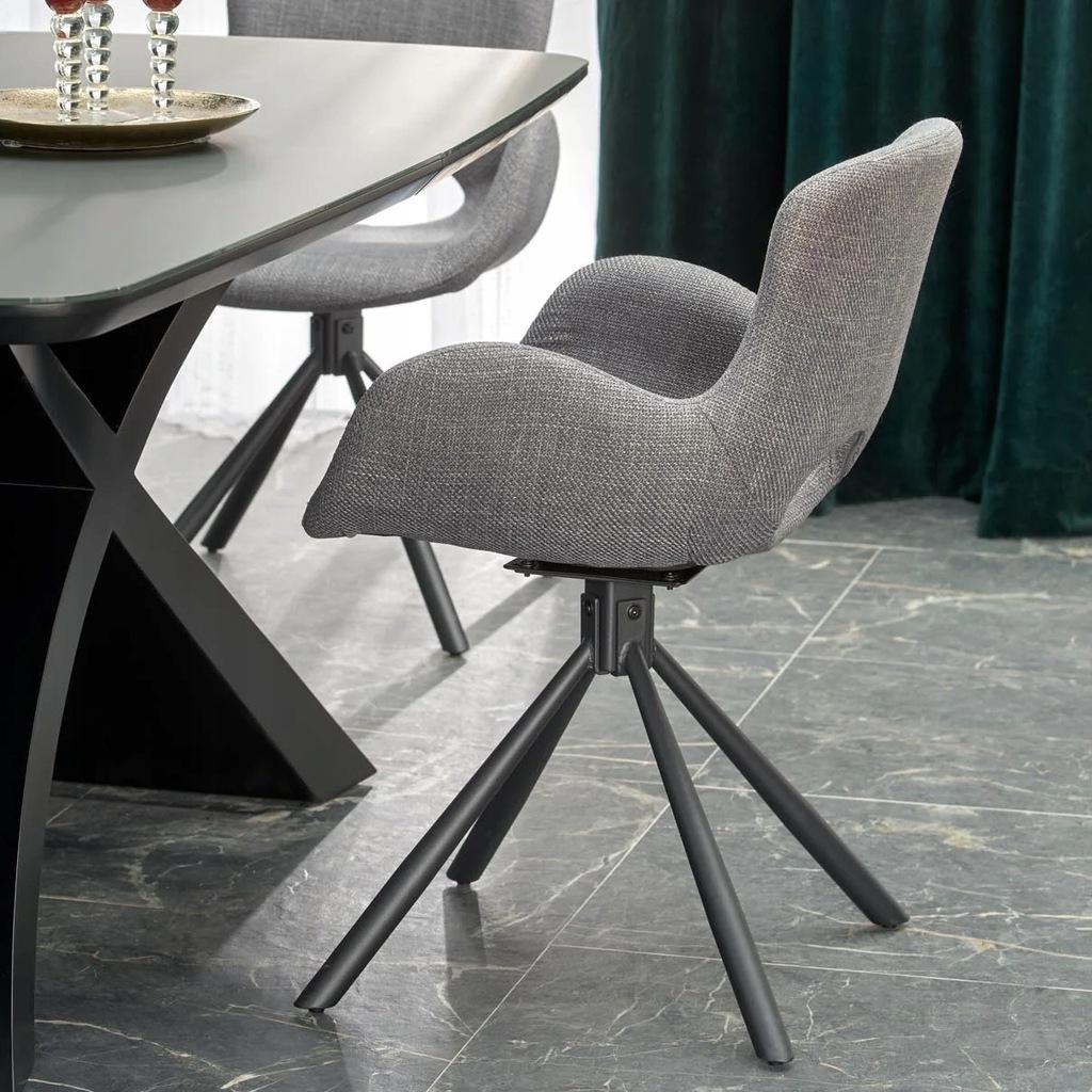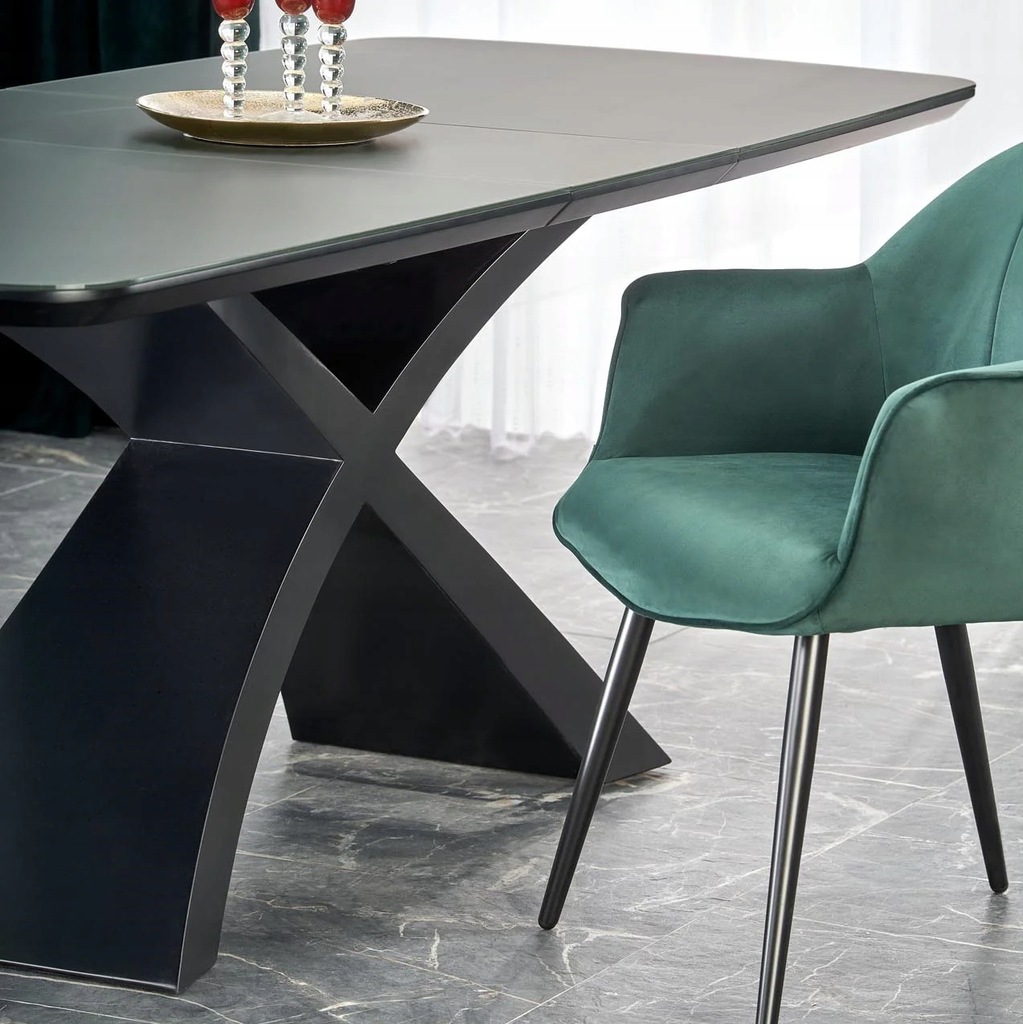 Podstawa stołu w kształcie litery X dodaje wnętrzu niepowtarzalnego charakteru, łącząc elegancję z nowoczesnym designem, co sprawia, że mebel staje się prawdziwą ozdobą każdego pomieszczenia.