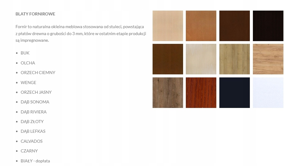 - Kolory wyświetlane na monitorze mogą nieznacznie odbiegać od rzeczywistych barw. Jest to spowodowane ograniczeniami techniki komputerowej min. parametrami monitora, przeglądarki. Prezentowane próbki kolorów należy traktować jako poglądowe. Wzornik z kolorami wybarwień drewna oraz tkanin jest materiałem poglądowym i nie stanowi podstawy do reklamacji.