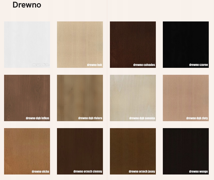 - Kolory wyświetlane na monitorze mogą nieznacznie odbiegać od rzeczywistych barw. Jest to spowodowane ograniczeniami techniki komputerowej min. parametrami monitora, przeglądarki. Prezentowane próbki kolorów należy traktować jako poglądowe. Wzornik z kolorami wybarwień drewna oraz tkanin jest materiałem poglądowym i nie stanowi podstawy do reklamacji.