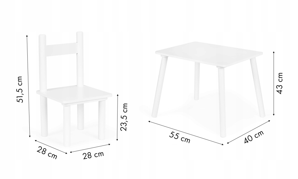 W komplecie znajdują się dwa wygodne krzesła, nogi wykonano z drewna sosnowego a siedzisko z MDF. Wymiary krzesełka są odpowiednio dobrane do stolika, tak aby gwarantowały maksymalną wygodę i swobodę ruchu.