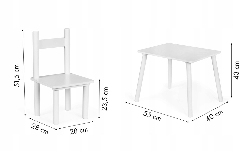 W komplecie znajdują się dwa wygodne krzesła, nogi wykonano z drewna sosnowego a siedzisko z MDF. Wymiary krzesełka są odpowiednio dobrane do stolika, tak aby gwarantowały maksymalną wygodę i swobodę ruchu.