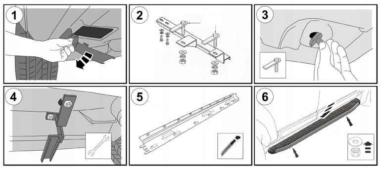✅ Przygotuj wszystkie niezbędne elementy do montażu progów, takie jak śruby, podkładki i nakrętki (w zestawie).