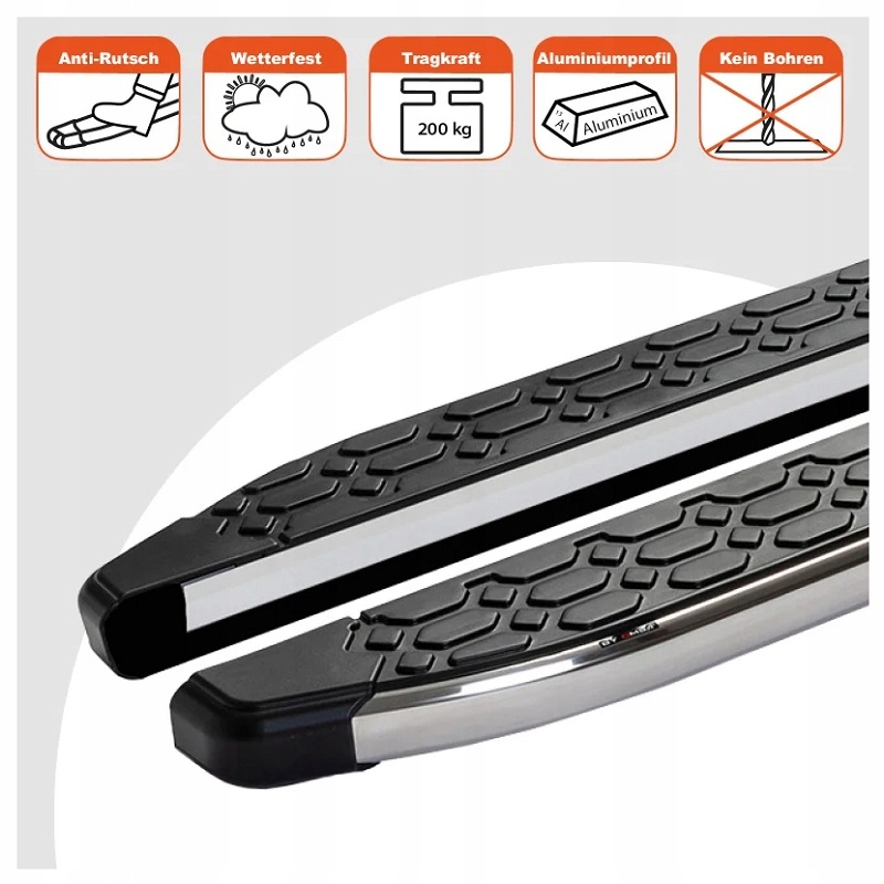 Dzięki aerodynamicznemu wzornictwu i sztywnemu profilowi wykonanemu z aluminium, progi zapewniają maksymalną nośność minimum 120kg. Nie boją się one warunków atmosferycznych, chemii czy soli drogowej, a powierzchnia antypoślizgowa zapewnia dodatkowe bezpieczeństwo. Wszystko to z 24-miesięczną gwarancją na nasze produkty.