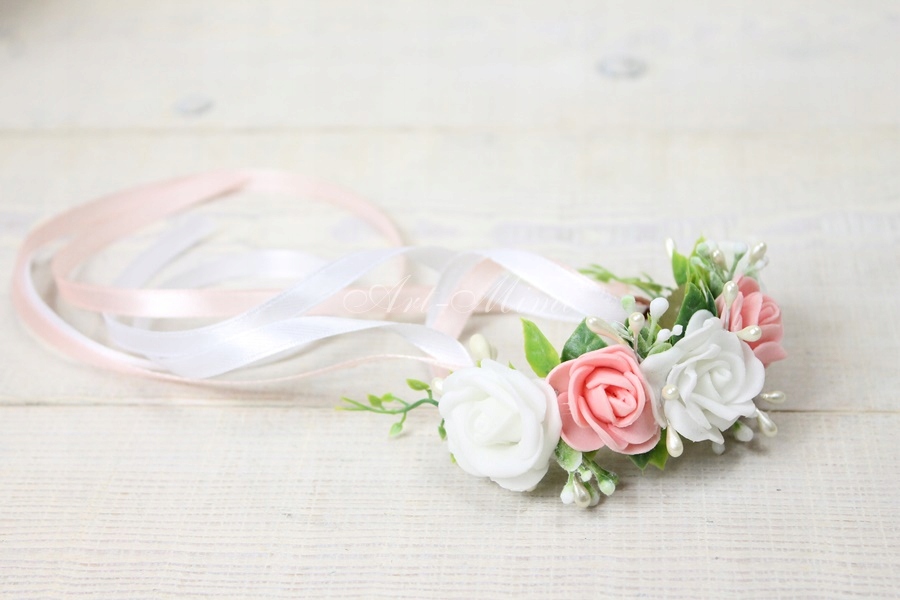 Wykonany z biało łososiowych kwiatów róży, zdobiony, listkami bluszczu który swoim kształtem przypomina serduszka, perłowymi pręcikami perełek oraz dekoracyjną trawką.